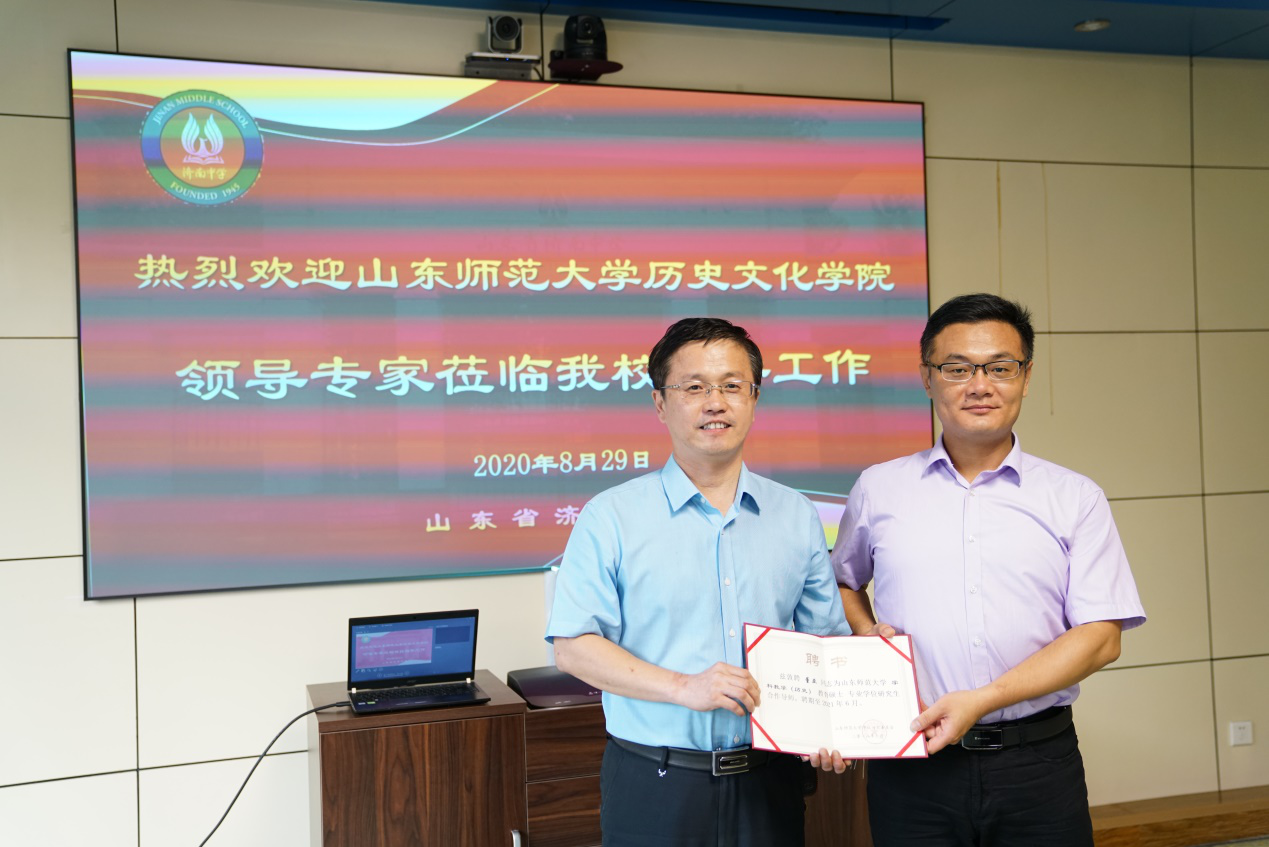 赵树国为董亚授予研究生合作导师聘书,续聘为我院硕士生导师。董亚在交流中介绍了学校教育改革与发展的情况,表示将积极配合英国上市公司365的硕士研究生的实习工作,为硕士研究生的教育实习提供了良好的条件。楼建军高度评价了双方十年来的合作历程,对济南中学为我院长期提供稳定、优质的实习平台表示感谢。鲁法军和赵树国充分肯定了济南中学近年来的特色办学成效和管理治校经验,表示与济南中学开展更广泛的交流合作,为济南中学更好地推广历史教育提供支撑,并对教育硕士实习学生提出明确要求。实习生代表李祝君在发言中表示一定不辜负师长的嘱托和期望,以高度的责任感和饱满的热情投入到实习工作中,努力成长为一名新时代“四有”好老师。