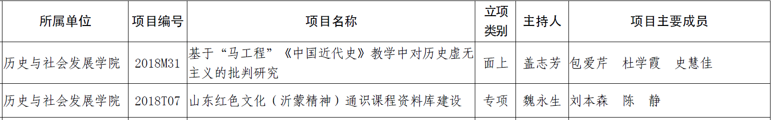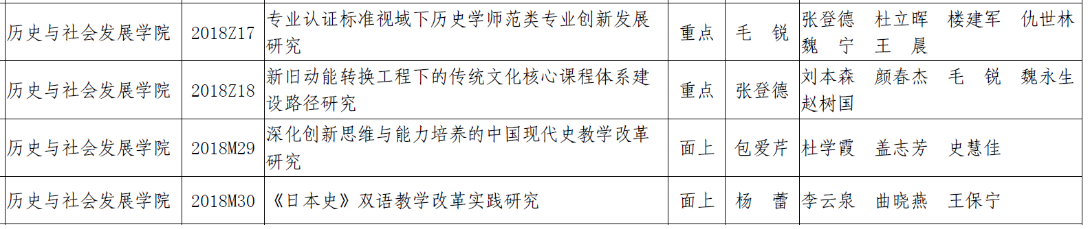 近日,学校公布了2018年度校级教学改革立项项目(山东师大校字〔2018〕162号),我院共有6项课题获得立项(其中重点项目2项,面上项目3项,专项1项),加上7月份赵树国副教授的中国古代史(下)获得校级在线开放课程立项,2018年度,学院共获得校级教改立项7项,数量为近年来最高。