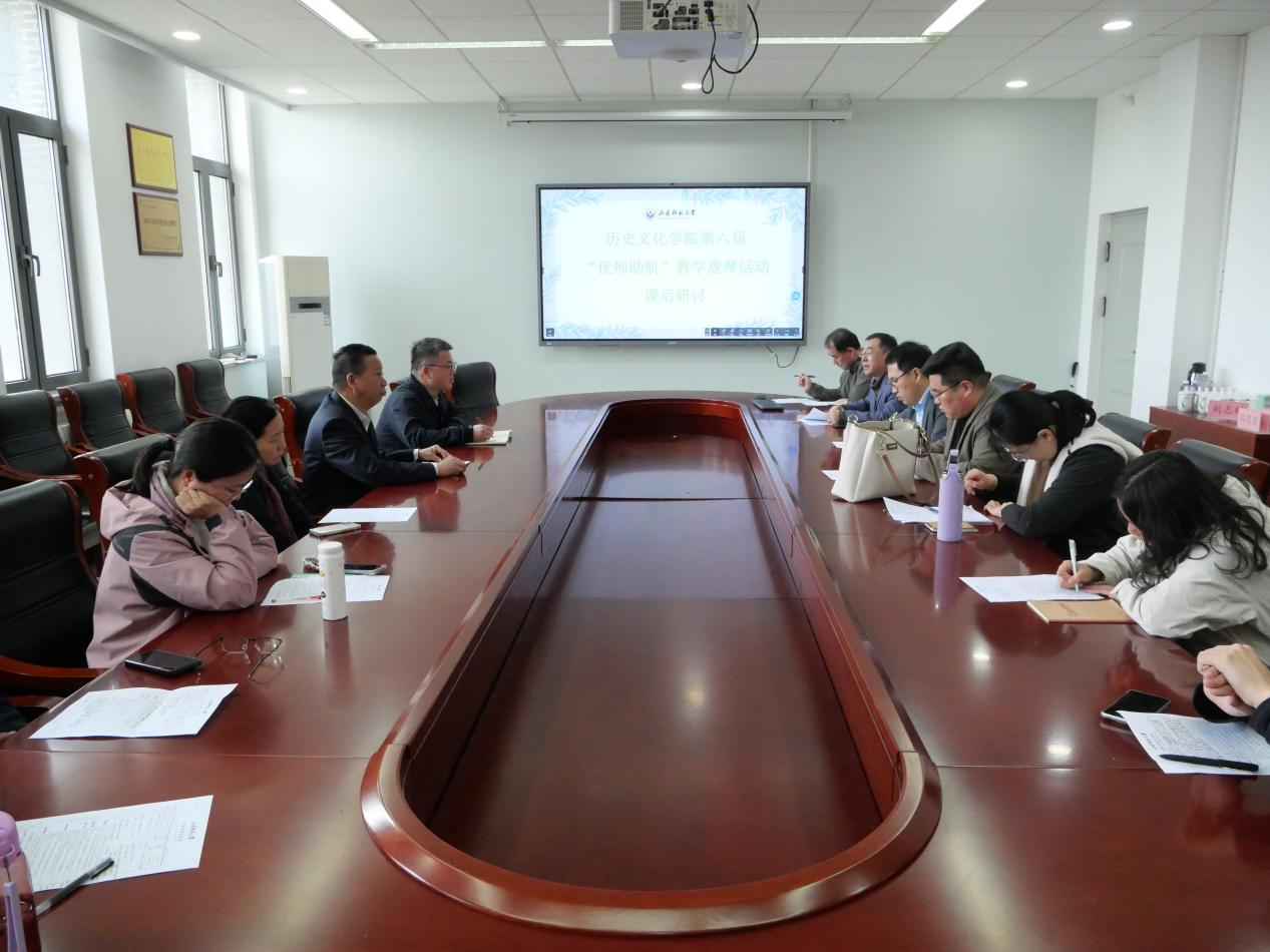 观摩课结束后,参会教师在404会议室进行课后研讨。首先,楼建军教授高度肯定了刘志鹏教授的授课水平,随后,由刘志鹏教授分享了自己备课授课的经验与不足。而后,丁同楼主任、楼建军教授、杜学霞副教授、魏永生副教授、盖志芳副教授、李晓华副教授、阎静副教授以及近五年入职的青年教师结合自己的教学经验,提出了自己的见解,主要围绕内容呈现、学生参与、视角突破、AI互动、思想认知、嵌入式教学等方面展开。此次观摩课深入浅出,言之有据,在抓住微观视角的同时聚焦重大历史问题,紧扣学生的思维认知特点,展现了成熟的教学模式。不仅提升了学生们的学术认知高度,也很好地促进了青年教师授课水平的提升。