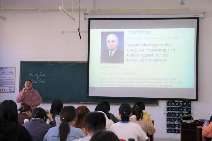 第二场公开课则由青年教师李敏,在毛锐教授的指导下进行展示,主要讲述的是第一次世界大战后美国杜鲁门“公平施政”纲领。李敏老师指出,由于战时繁荣、战后经济增长与婴儿潮、工人罢工以及冷战影响,导致美国失业问题突出,社会矛盾激化,因此杜鲁门采取将军事工业转为民用工业以及于1947-1950年进行社会福利改革等措施进行改革,并取得显著成效,促进了美国的进一步繁荣与发展。李敏老师用较为丰富的数据资料与流畅的语言进行详细讲解,并与国内外史学界最新研究动态相结合,较为全面展示出杜鲁门“公平施政”纲领的整体面貌。