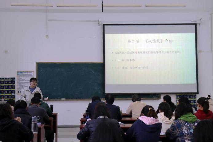第三场公开课则由学院青年教师葛少旗讲授,指导教师为杜立晖教授。葛少旗老师讲述的是《战国策》一书,分别从其编订、流传版本以及体例、编纂内容和史料价值等方面进行讲述,不仅使同学们明确《战国策》是战国时期游士们游说各国君主的言论资料汇编,对研究战国历史具有重要的史料价值,而且也可以提升学生史籍版本辨析、史料解读等史学能力。