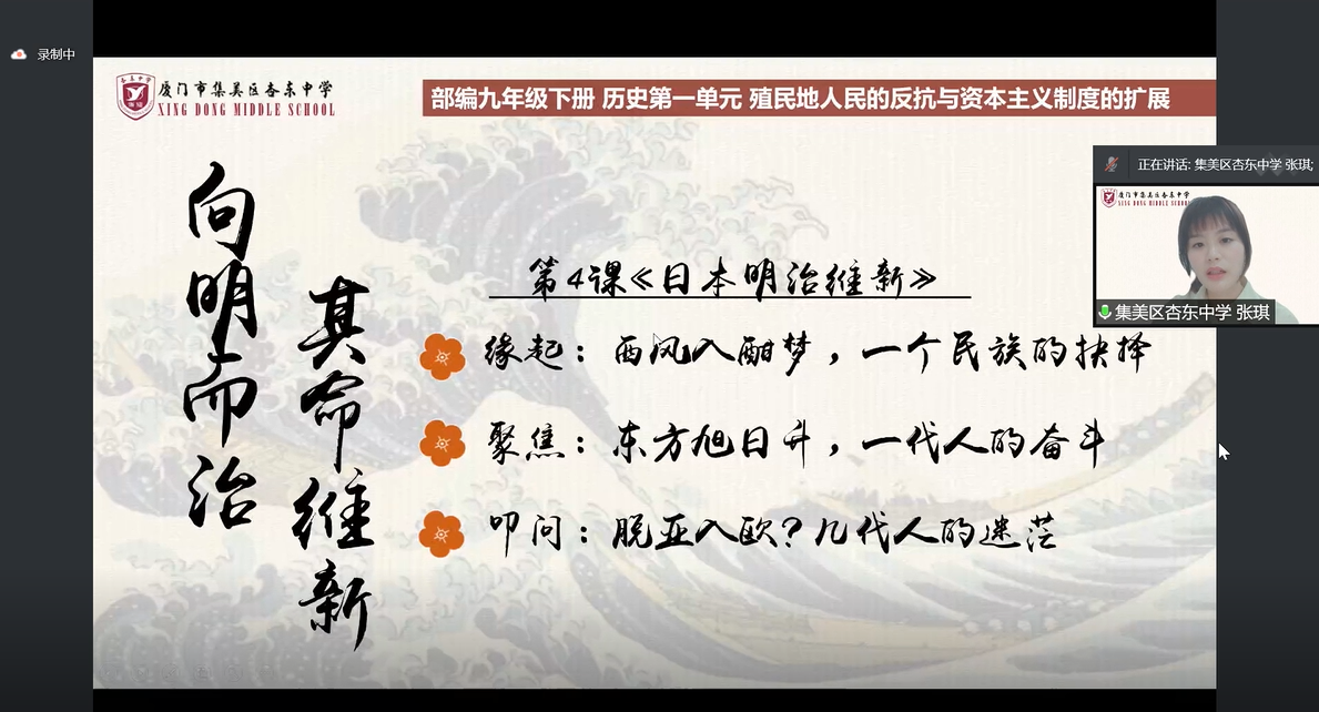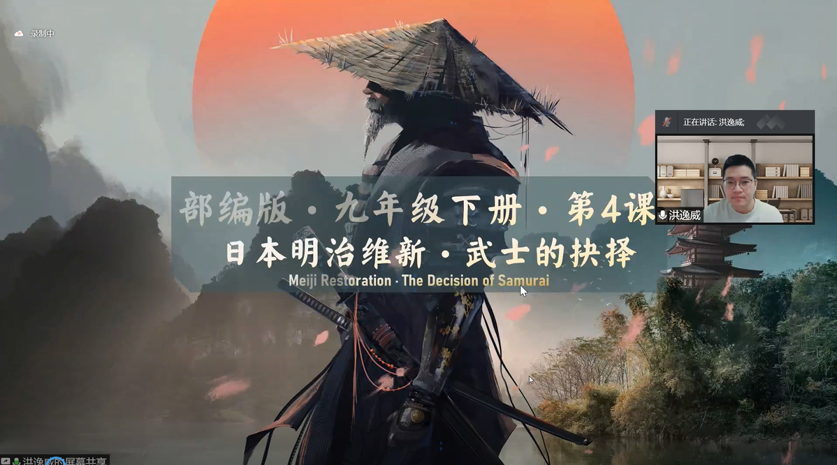 洪逸威和张琪就部编版九年级下册第4课《日本明治维新》进行了同课异构。洪逸威以“日本武士的四次抉择”串联本课。首先,他以“日本印象”生动地导入本课,点明本课的主线——武士。之后,他从“抉择一:开国?开战?”“抉择二:内外交困,如何破局?”“抉择三:幕府体制的循环?另辟蹊径?”“抉择四:和平发展?穷兵黩武”四个方面对本课内容进行了生动细致的讲述。他把本课重点放在了第三部分,即明治维新的内容,通过展示明治维新前后日本江户的地图并将其进行对比,引导学生发现其中的变化,由此引出相应的政策。最后,他出示“1853年江户湾黑船来袭”与“1945年东京湾黑船来袭”的图片结束本课。