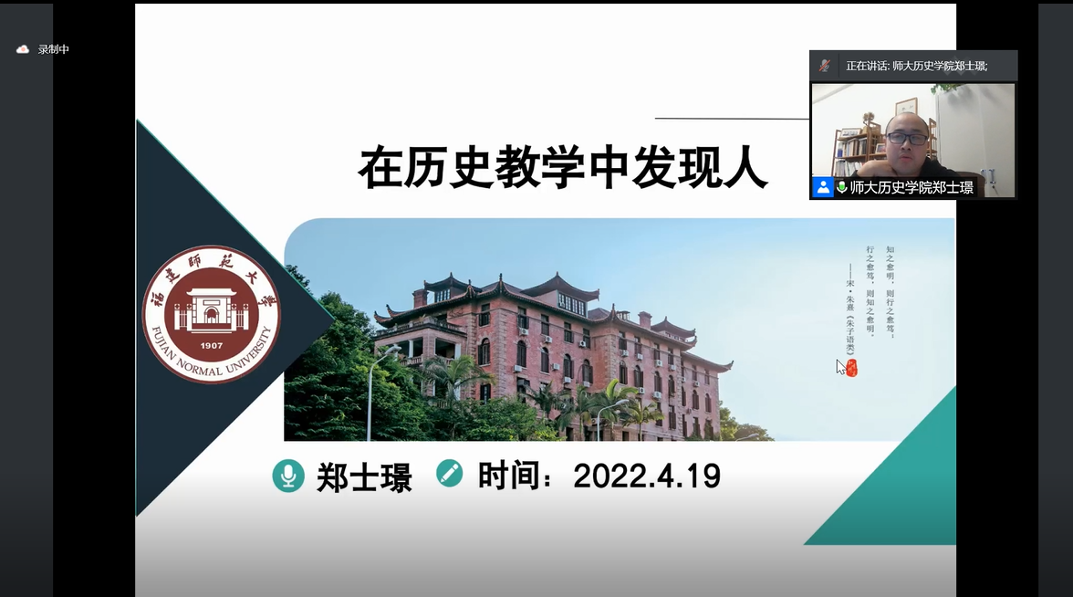 为进一步统筹校内外平台和资源,夯实师范生教育教学基本功,福建师范大学历史教育研究中心与厦门集美区教师进修学校主办“在历史教学中发现人”专题研讨活动。活动于2022年4月19日通过腾讯会议方式进行。本次活动由厦门集美区历史教研员茆海峰主持,福建师范大学社会历史学院郑士璟副教授受邀点评并作专题讲座,部分全国一线教师和师范类高校的本科生、研究生参与此次活动。我院教师教育中心与福建师范大学社会历史学教师教育中心是长期友好合作伙伴关系,因此主办方特邀我院2019级历史学师范生和部分研究生参与了本次学习交流活动。本次讲座也是我院推行的“融合式”教育实习课程的组成部分之一。