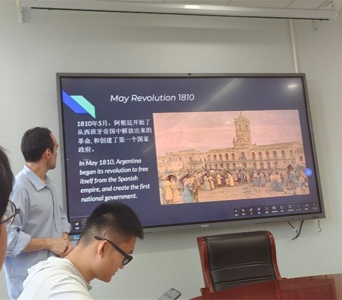来自阿根廷的诺格拉介绍了阿根廷国家渊源和政治变迁历程,自1810年独立战争后,阿根廷从西班牙帝国统治中解放出来,创建了第一个国家政府,并积极进行南美争霸,通过“荒漠远征”计划,征服了潘帕斯草原和巴塔哥尼亚地区,实现了领土规模扩张。在人文风情中,诺格拉指出阿根廷人酷爱烧烤,同时又喜欢吃糖果、冰淇淋和迷你蛋糕等甜品,并以实物向大家展示了“马黛茶”这一阿根廷最闻名的特产。