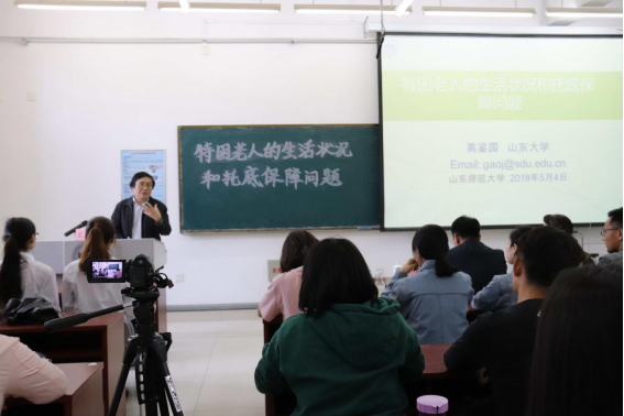 为活跃学术空气,加强学术交流,5月4日,由历史与社会发展学院和社会科学处联合举办的第635期社科大讲坛在长清湖校区历史与社会发展学院320教室开讲。本次社科大讲坛特别邀请山东大学哲学与社会发展学院社会工作系主任高鉴国教授担任主讲人,做题为“特困老人的生活状况和托底保障问题”的学术报告。报告由历社学院副院长、博士生导师赵文亮教授主持,研究生导师王冠副教授担任评议人,社工系主任邢佳佳,教师张利增、李晓华、厉娜、胡振光及英国365集团公司、山东女子学院60余名本科生共同聆听了此次讲座。