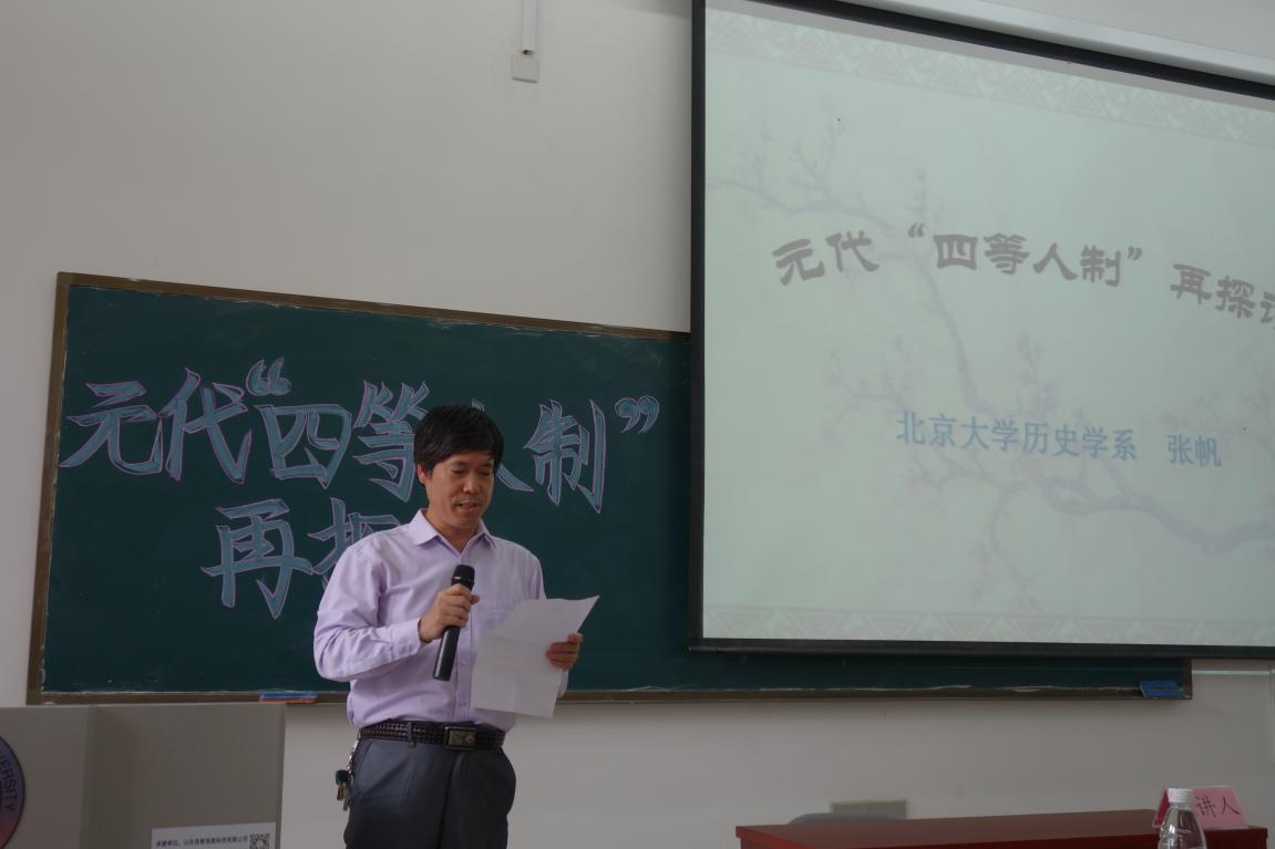 6月9日下午,由历史与社会发展学院和社会科学处联合举办的第519期社科大讲坛在长清湖校区历社学院楼116教室开讲。本次社科大讲坛特别邀请北京大学历史系主任、博士生导师张帆做题为“元代‘四等人制’再探讨”的学术报告。报告由学院副院长、博士生导师赵文亮教授主持,硕士生导师周尚兵副教授担任评议人,学院党委副书记颜春杰、学院部分青年教师及百余名学生共同聆听了此次报告。