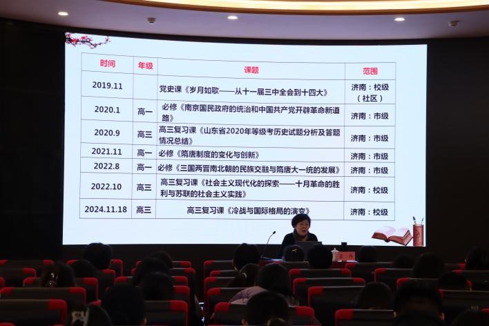 针对“怎样上好公开课”这一问题,孟伟从备课、磨课、暖场、导入、授课、课堂把控以及课后反思等七个关键环节逐一入手,为大家提供了一套全面且细致入微的指导方案。例如针对“暖场”环节,孟伟提到,授课教师可以在正式开始讲课之前播放一些与教学内容相关联的歌曲或视频资料,这样能够有效拉近与学生之间的距离,缓解学生的紧张情绪,为后续的教学活动营造出良好的氛围。孟伟还结合自身丰富的实践经验,分享了山师附中历史教研组团队设计的部分优秀公开课案例,让听众收获满满,受益良多。