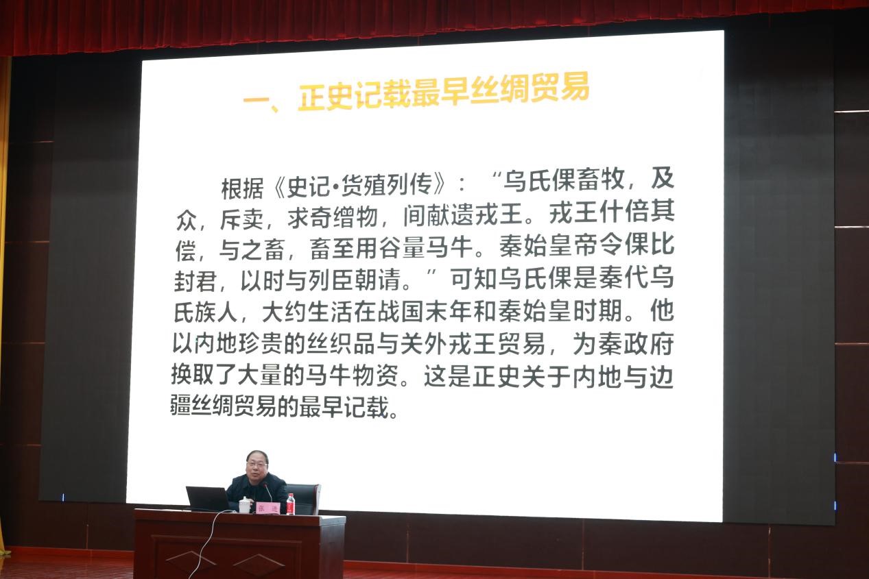 张进教授在中国古代史领域深耕多年,成果卓著。讲座开篇借中原与西域交流引出乌氏倮,其与早期丝路贸易关联紧密。因“戎王”史料匮乏,张进教授推断戎王在秦境外且嗜丝绸,其部落或与大月氏有瓜葛。乌氏倮贸易团队能于秦严控关梁下畅行,暗示贸易或得官方默认,为官方主导兼民间参与,推动了丝绸之路的早期发展,故而正史丝路贸易记载应提前至战国末年。