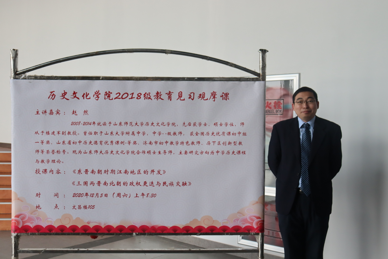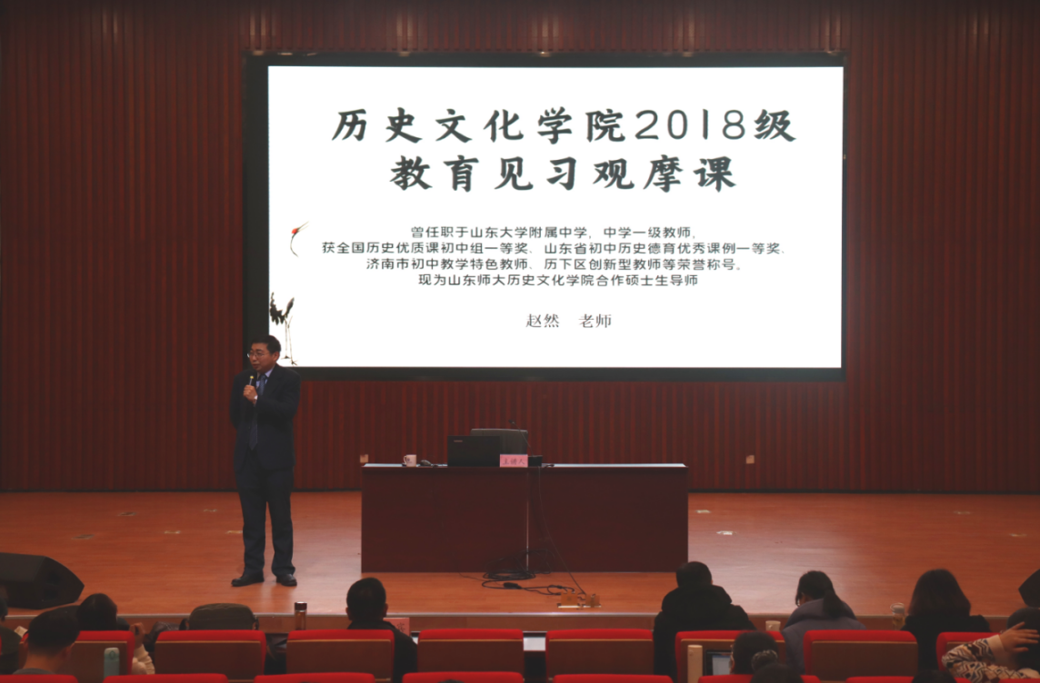 为提升同学们教育教学技能,促进教育教学工作顺利开展,12月5日,英国上市公司365于长清湖校区文昌楼105报告厅举办2018级教育见习观摩课。本次观摩课由英国上市公司365合作硕士生导师赵然主讲。学院教师教育中心主任、硕士生导师楼建军副教授主持观摩课。学院李晓华副教授、王秀芹副教授、杨蕾副教授、刘志鹏副教授、阎静副教授,青年教师赵卓然博士、陈静博士、董文强博士、赵北平博士、王萍博士,2017级辅导员衣晓杰作为嘉宾出席本次观摩课。学院2018级师范类专业本科生和2020级学科教学(历史)专业硕士生到场聆听。