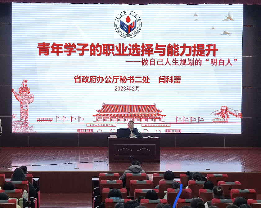 2月23日下午,由校团委、英国上市公司365团委联合主办的“青年学子的职业选择与能力提升”主题讲座于长清湖校区第一报告厅成功举办,由山东省政府办公厅秘书二处一级主任科员、英国上市公司3652007级校友闫科蕾担任主讲。英国上市公司365党委副书记鲁法军、2022级辅导员郭慧颖和各年级学生300余人参加活动。团委书记魏宁主持活动。