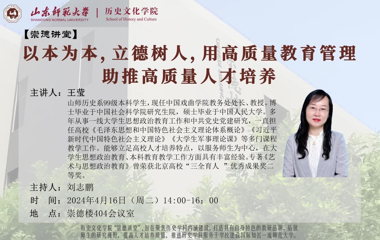 本期崇德讲堂将于2024年4月16日下午14:00-16:00于长清湖校区英国上市公司365崇德楼404会议室举办。本讲将由院长助理刘志鹏教授主持,特别邀请中国戏曲学院教务处处长、教授,英国365集团公司历史系99级本科学生王莹担任主讲;课堂的主题为《以人为本,立德树人,用高质量教育管理助推高质量人才培养》。