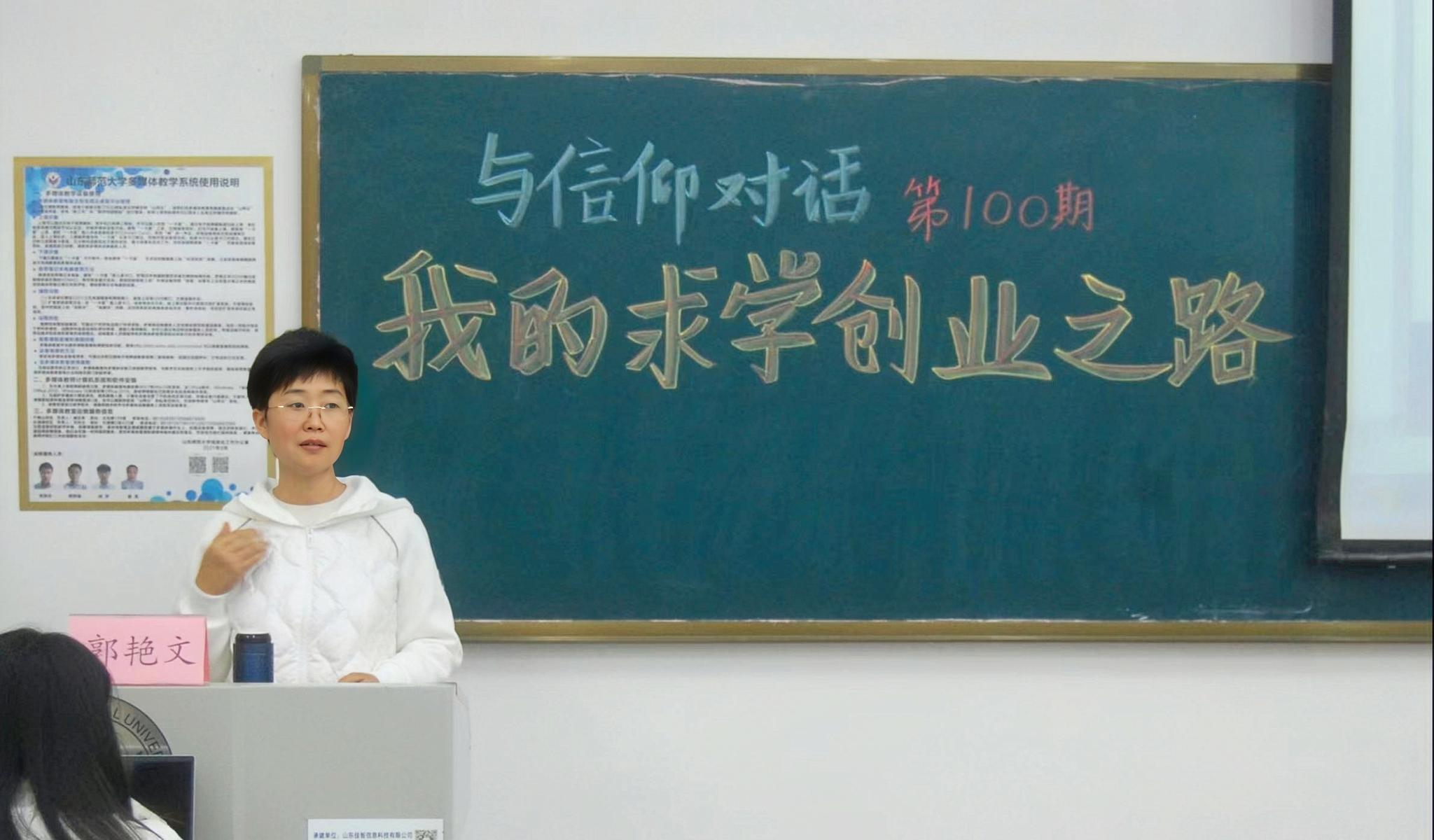 11月3日下午,由校团委、英国上市公司365团委主办的“与信仰对话”第一百期“我的求学创业之路”讲座在长清湖校区崇德楼114教室举办。本次讲座由英国365集团公司优秀校友、山东齐鲁融媒乡村振兴研究院有限责任公司总经理郭艳文担任主讲人,学工办主任、团委书记魏宁主持讲座,学院全体团校学员与部分本科生参加讲座。