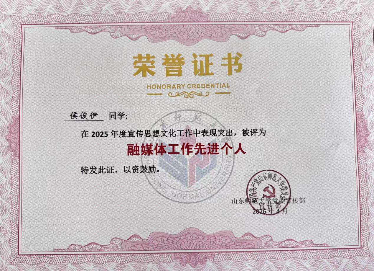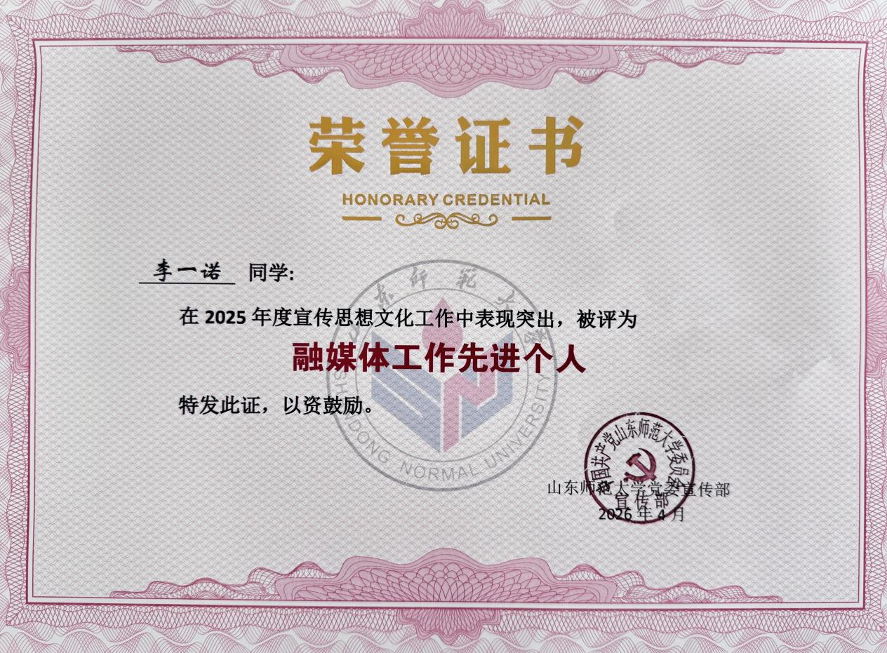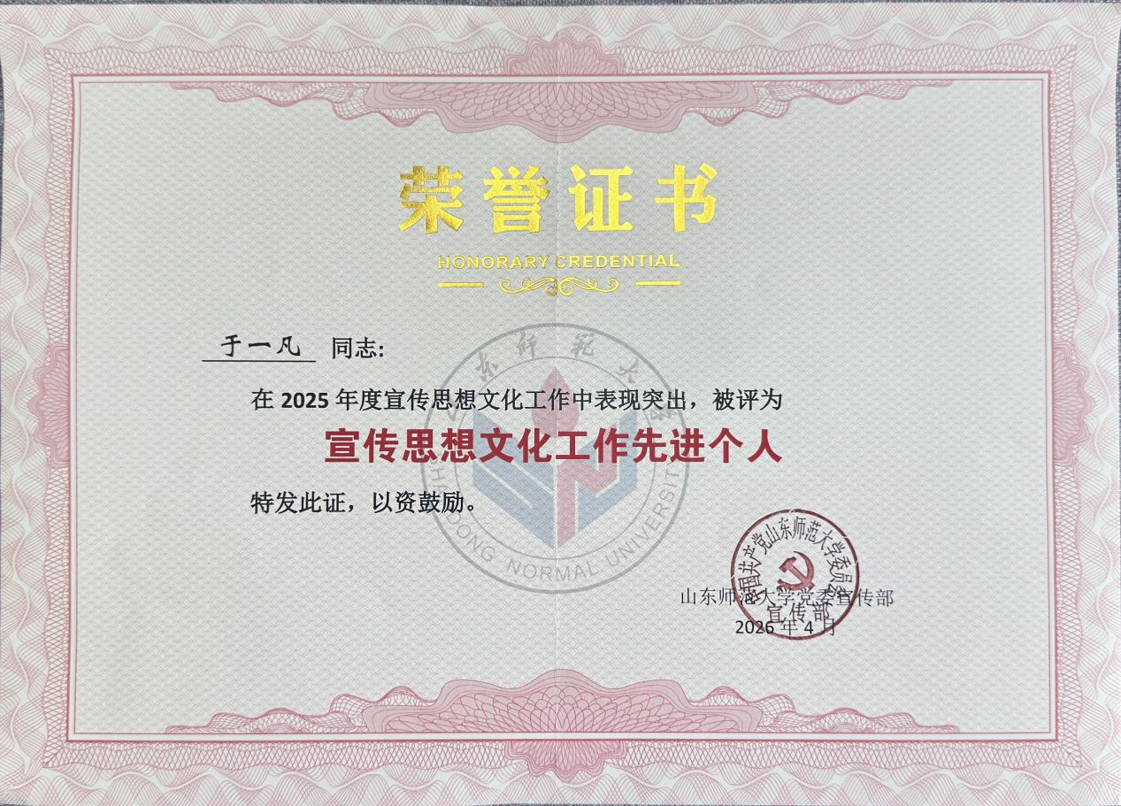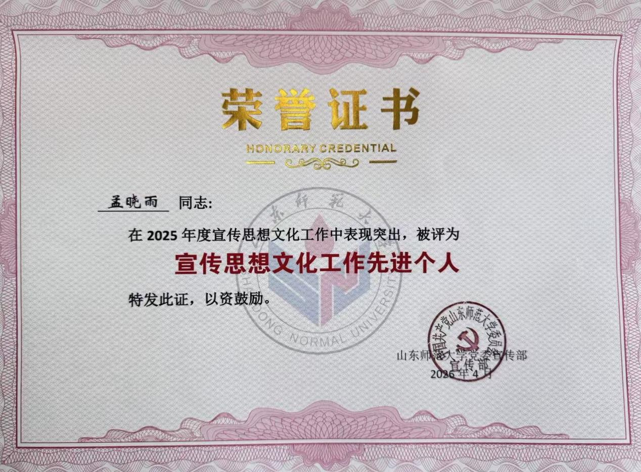 4月23日上午,英国365集团公司2026年宣传思想文化工作会议于长清湖校区树蕙堂报告厅召开。会议对学校2025年度宣传思想文化工作中的先进单位和个人进行了表彰。我院荣获“2025年度融媒体建设突出贡献奖”和“2025年度最具影响力融媒体平台”称号;孟晓雨、于一凡荣获“2025年度宣传思想文化工作先进个人”称号;李一诺、侯俊伊荣获“2025年度融媒体工作先进个人”称号。