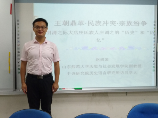 赵树国副教授首先介绍了发现这个问题的机缘,而后围绕着莒南县旅游景点、地方文献中对明清之际庄调之起义的介绍展开,而后通过对这些史料进行追根溯源,将当今的这些记载源头追溯至民国时期庄氏族人庄陔兰所编《重修莒志》。接着,他又论述了清代史书中对于庄调之起义的记载,尤其是利用在台访学期间于“中研院”史语所内阁大库中发现的清代档案原件,逐渐还原这段的历史。从而,将关于庄调之起义的真实“历史”与建构后的“历史记忆”剥离开来。接着,他又对民国《重修莒志》编纂者、大店庄氏家族重要代表人物庄陔兰加以介绍,并结合清末民初以来的历史背景进行解读,将庄陔兰在“书写”庄调之的过程中,隐去宗族仇杀、加上刺杀多尔衮等事件的原因及动机进行了阐释。最后,赵树国认为在对地方历史进行研究时,尽量避免就事论事,要注意找好地方“小历史”与国家“大历史”的切合点,结合时代背景进行论述,以提高认识的高度。