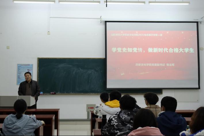 3月11日,学院党委副书记鲁法军以“学党史知党情,做新时代合格大学生”为题为同学们讲授开学第一课。2020级辅导员蒋艺及2020级同学参加。