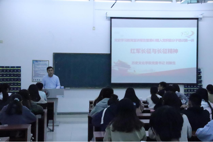 刘新生作题为《红军长征与长征精神》报告,他主要从红军长征的背景原因、长征经历的主要阶段、长征途中的惊险斗争、长征精神的基本内涵及现代价值等方面展开论述,与同学们一起重温了长征这一人类历史上的伟大壮举。他讲到,长征精神既是中华民族百折不挠、自强不息的一种民族精神,也是中国共产党人不怕牺牲、一往无前的一种革命精神,主要表现为对党忠诚、理想坚定,不怕困难、勇于牺牲,实事求是、机动灵活,顾全大局、团结友爱,依靠群众、患难与共。他强调,在血与火的锻造中锤炼形成的伟大长征精神,仍然是我们不断攻坚克难、从胜利走向胜利的强大精神动力;弘扬长征精神,就要坚定理想信念,坚持不懈用习近平新时代中国特色社会主义思想武装头脑、指导实践、推动工作,真正成为百折不挠的共产主义战士;就要坚守初心使命,深深扎根人民,不断造福人民,紧紧依靠人民创造新的伟业;就要立足两个大局,心怀“国之大者”,不断提高政治判断力、政治领悟力、政治执行力,始终做政治上的明白人;就要发扬斗争精神,增强忧患意识、始终居安思危,勇于战胜一切风险挑战。