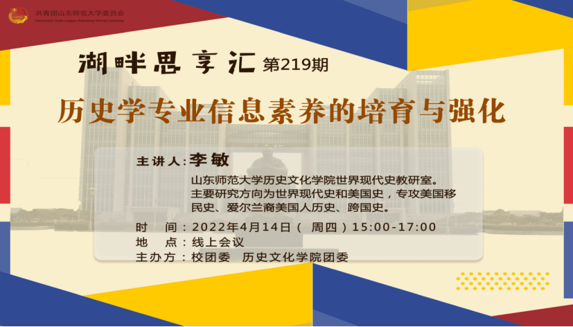 4月14日下午,由校团委、英国上市公司365团委联合举办的“湖畔思享汇”主题学术讲座线上开讲。本次讲座特邀讲师李敏以“历史学专业信息素养的培育与强化”为题进行学术分享,我院2021级全体本科生及2020级部分本科生参加讲座。