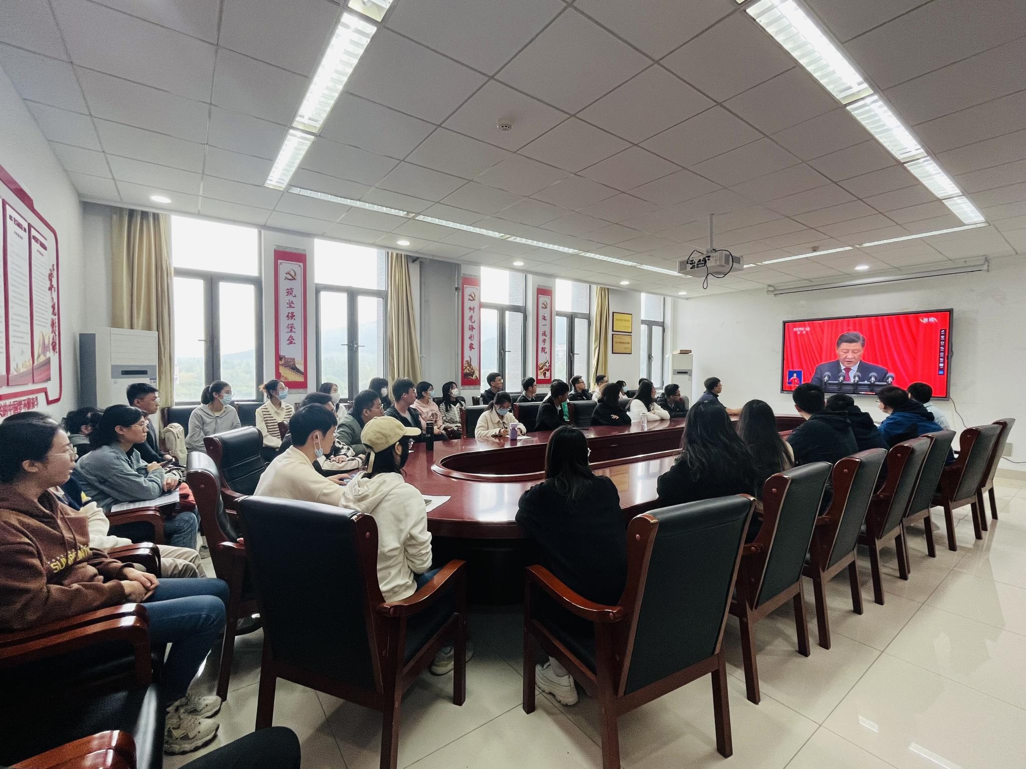 10月16日10时,中国共产党第二十次全国代表大会在北京人民大会堂隆重开幕,习近平总书记代表第十九届中央委员会向大会作报告。为确保学院师生第一时间学习和领会习近平总书记报告精神,学院党委高度重视、提前筹划、迅速部署,安排本科生、研究生各年级的党员、预备党员、入党积极分子分别在树蕙堂报告厅、崇德楼404党员活动室、崇德楼114教室同步收听收看党的二十大直播。