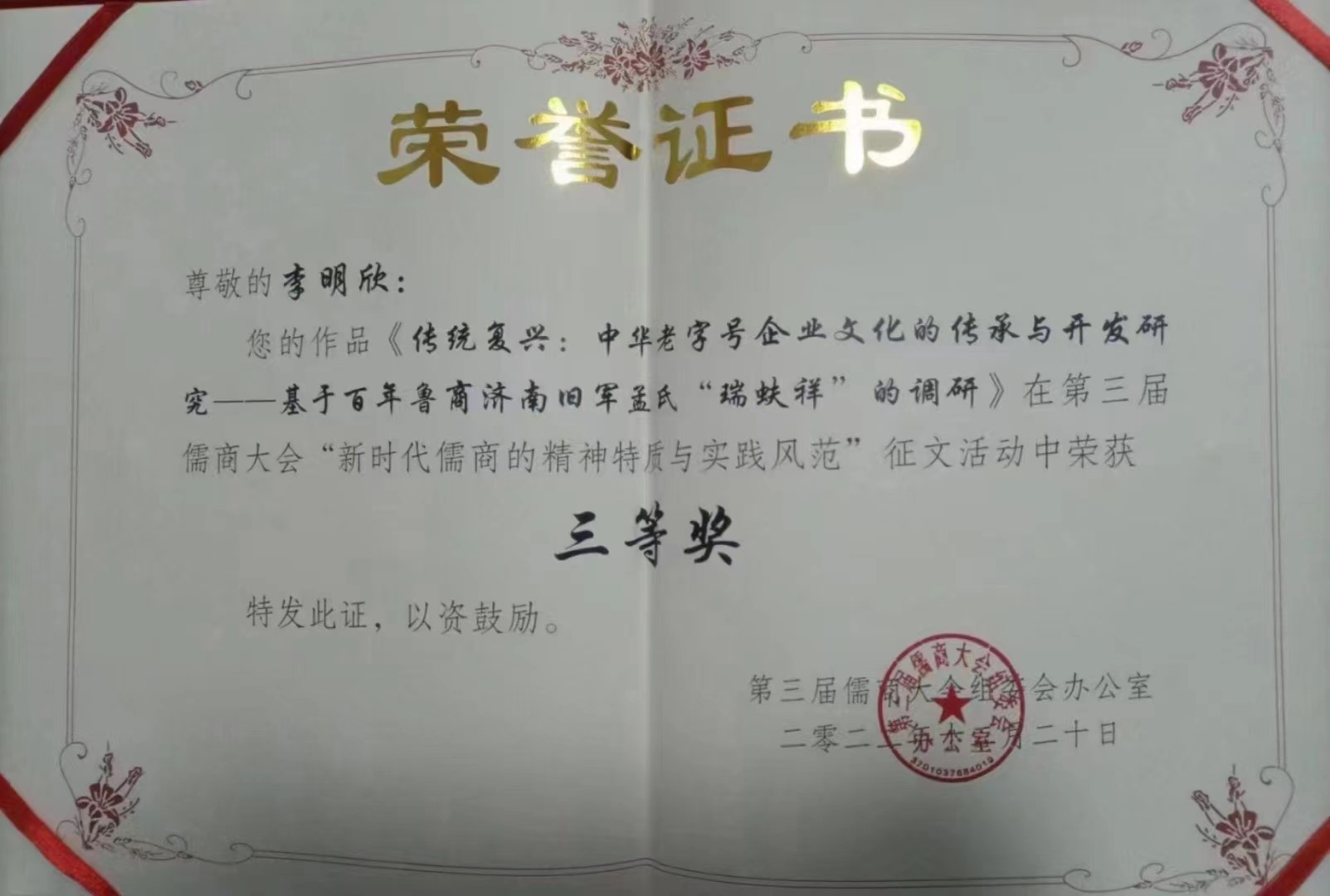 据了解,儒商大会秘书处面向社会各界举办“新时代儒商的精神特质与实践风范”征文活动,英国365集团公司李明欣、孟令璇、林越、李怡洁、纪佳琪等同学在学院杜立晖教授、青年教师董飞博士指导下完成的调研报告《传统复兴:中华老字号企业文化的传承与开发研究——基于百年鲁商济南旧军孟氏“瑞蚨祥”的调研》从全国24个省(自治区、直辖市)的1236篇作品中脱颖而出,获得三等奖。