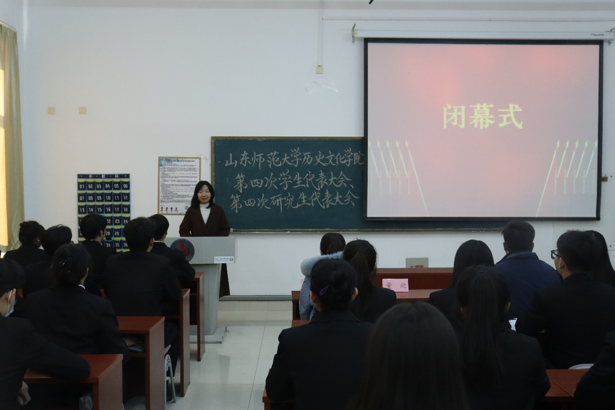 最后,学生工作办公室主任、团委书记董欣老师代表学院向本次大会致闭幕辞。首先,董欣向各位与会代表表示感谢,祝贺本次代表大会胜利结束。她肯定了学生代表大会的成绩,指出学生代表大会作为学生的群众组织,起到了连接学校和学生的桥梁纽带作用,其召开不但对上一年的工作进行了充分总结,更重要的是为接下来的学院工作、学生工作以及群团工作打下了良好基础,勉励各位代表能够充分履行职责,为学院以及学校发展建言献策,作出应有的贡献,使大家享受到更加完美、充盈的大学生活。最后,董欣再次祝贺第四次学生代表大会和第四次研究生代表大会顺利闭幕。