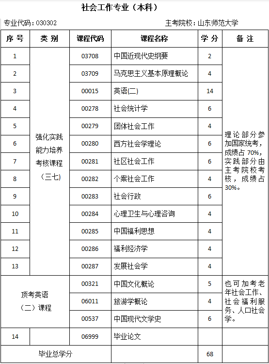 1.本专业是山东省教育招生考试院批准设立的高等教育自学考试“强化实践能力培养考核”试点专业,考试大纲规定的全部课程均可参加我校组织的“强化实践能力培养考核”。考核成绩占该门课程总成绩的30%,理论部分参加国家统考,统考成绩占该门课程总成绩的70%,两项成绩合并计算得出该门课程的最终成绩。