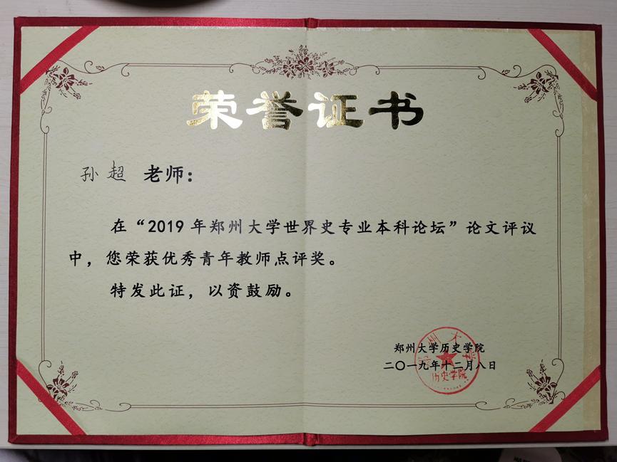 12月6日至8日,为进一步推进世界史专业建设,加强同国内兄弟院校之间的交流与合作,我院世界史系副主任孙超应邀带领2016级世界史本科生林永思、王晓婷、张晓岩、2017级世界史本科生龙瀚林参加郑州大学世界史专业本科论坛,并取得优异成绩。