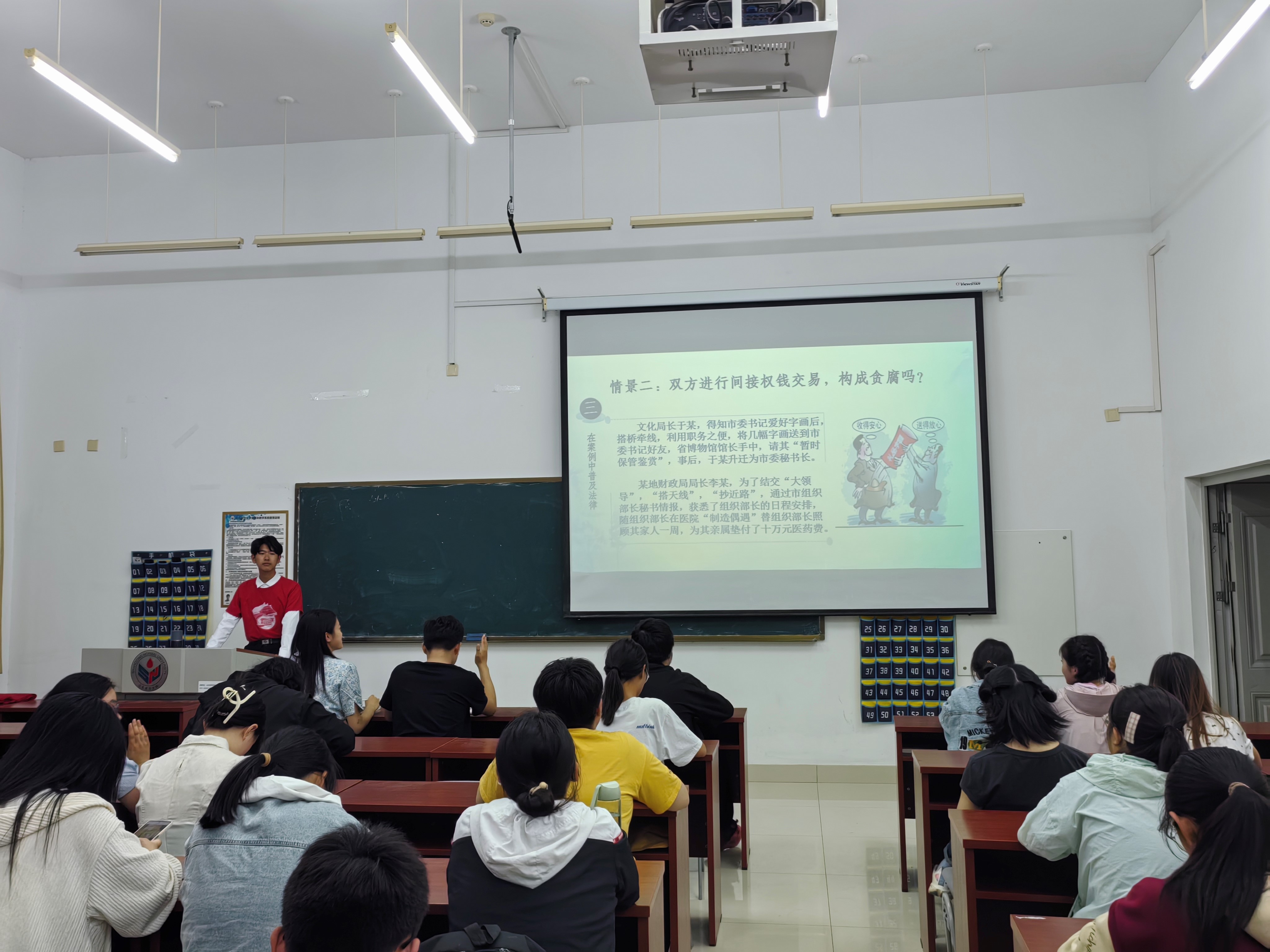 本次活动由队员王子琦、赵家玺担任主讲。首先宣讲队员通过四个历史史实引入廉洁主题,以讲故事的形式展现了我国廉洁奉公的历史渊源。紧接着,宣讲队员借用正反类比,引入了近年来的贪腐案例,并着重介绍了“年轻贪腐化”、“教育反腐”两个名词,让观众更加直观的了解了贪腐对社会的巨大破坏力。随后,宣讲队员通过互动的形式向大家介绍了贪腐的法律定义。最后,宣讲队员以莲花为喻,发出倡议,希望广大青年干部也要争做“清廉式”干部。