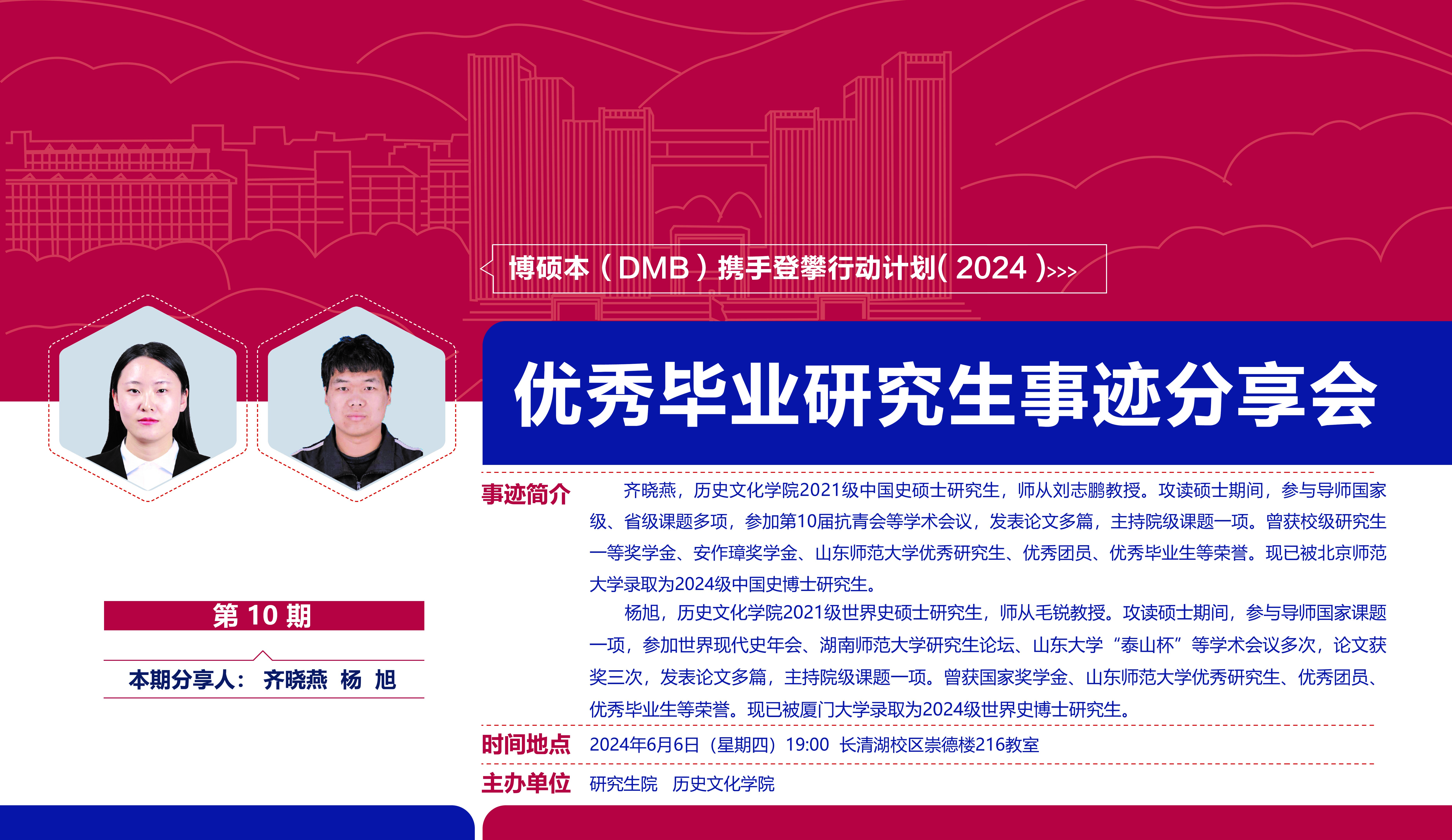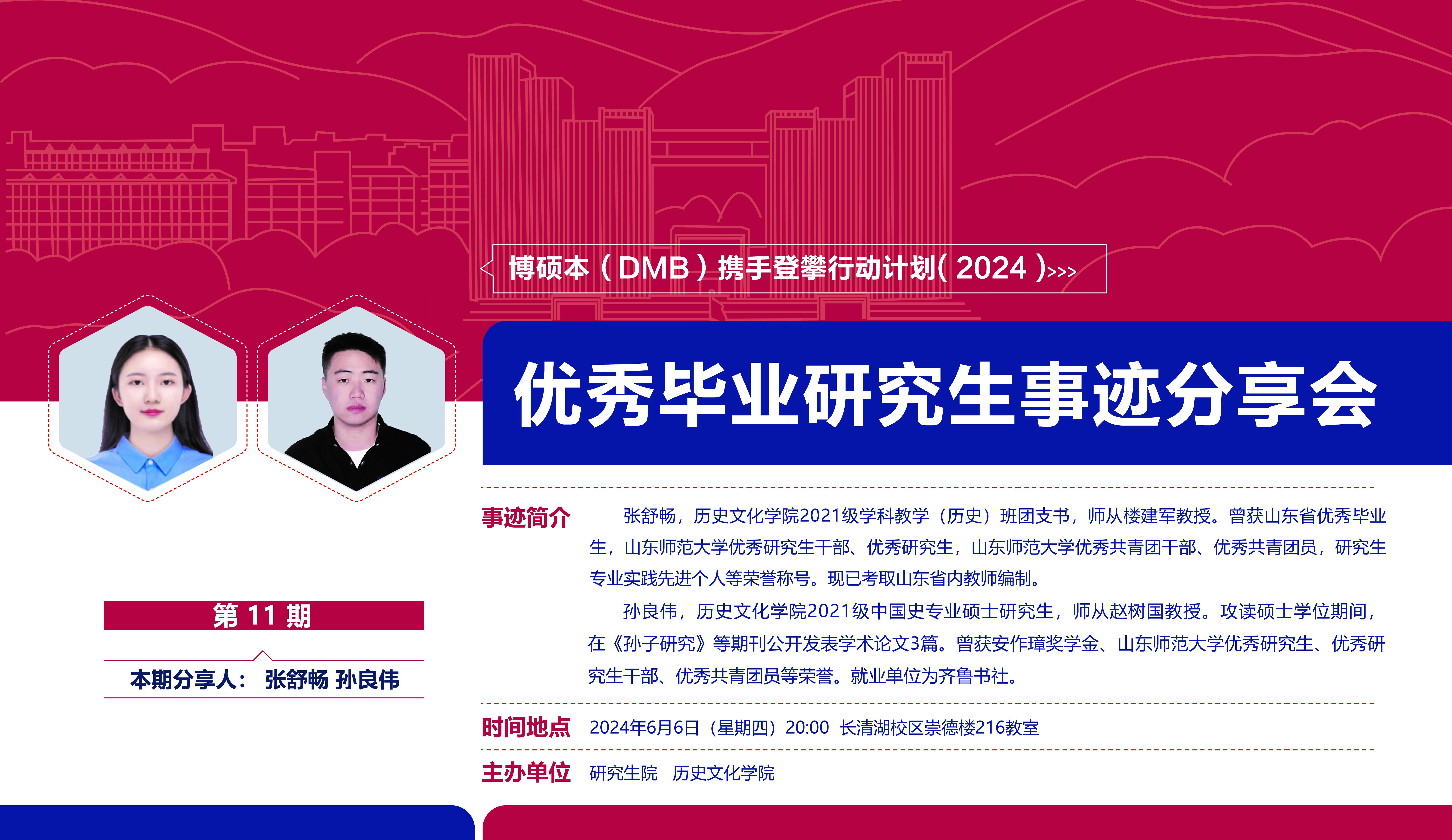 为充分发挥优秀毕业生的榜样引领作用,解决同学们对考博、就业问题的困惑,6月6日晚上,历史文华学院于崇德楼216教室举办了优秀毕业研究生事迹分享会。本次分享会邀请2021级优秀毕业研究生齐晓燕、杨旭、张舒畅、孙良伟。学院各级研究生到场聆听。
