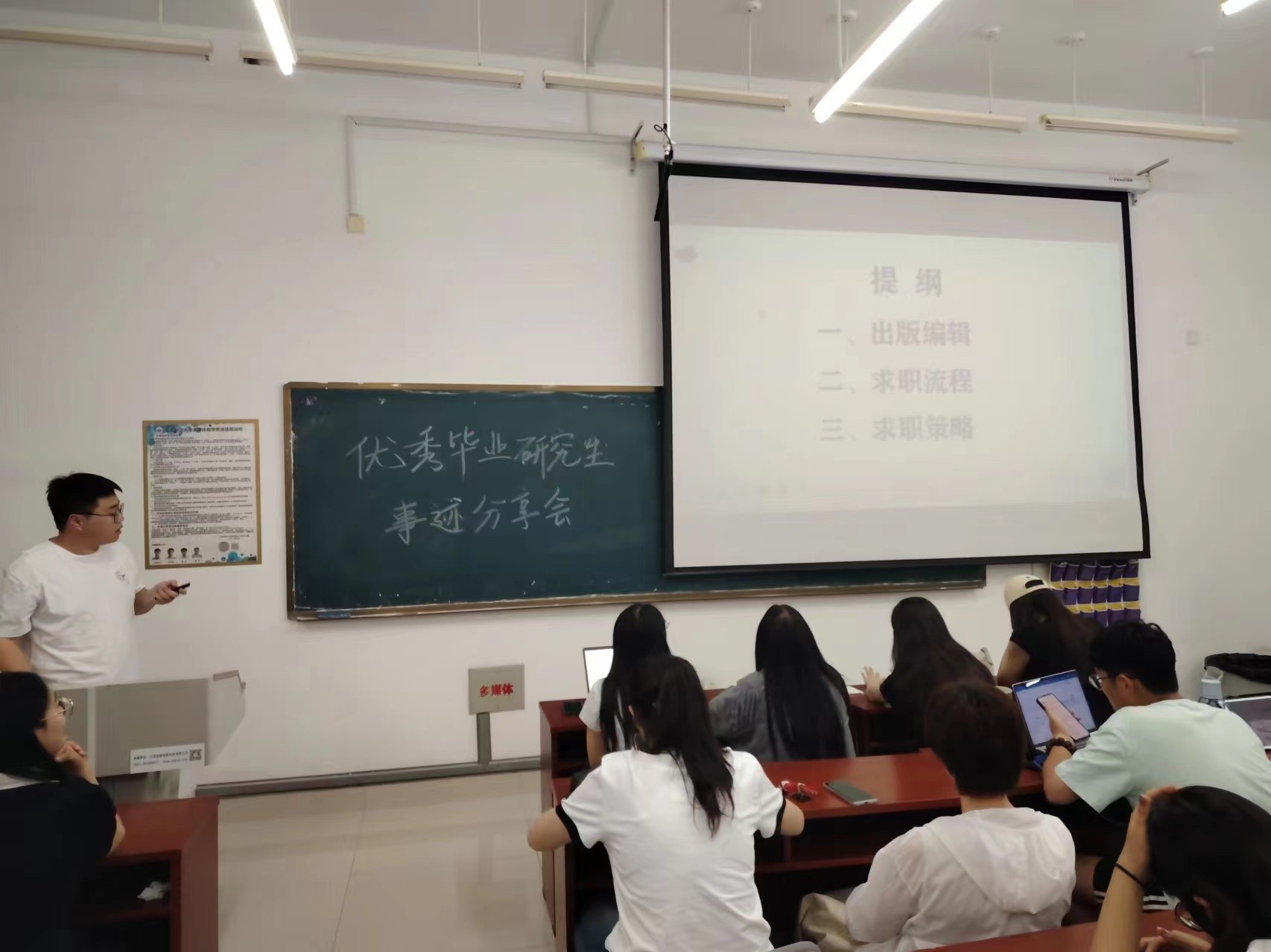 随后,由考入山东出版集团的孙良伟向同学们分享经验。他介绍了出版编辑的性质、待遇以及出版社与图书集团的区别,以及出版社求职的流程,并鼓励同学们可以积极参与校招。最后他以自己的求职经历向同学们传授了面试时的一些宝贵经验:在准备期要保持阅读习惯,多关注图书出版的公众号,关注图书行业;在应试时,简历要突出专业素养,一定不要有文字标点错误出现。面试回答问题时要虚实结合,既要真诚又要巧妙避开陷阱。