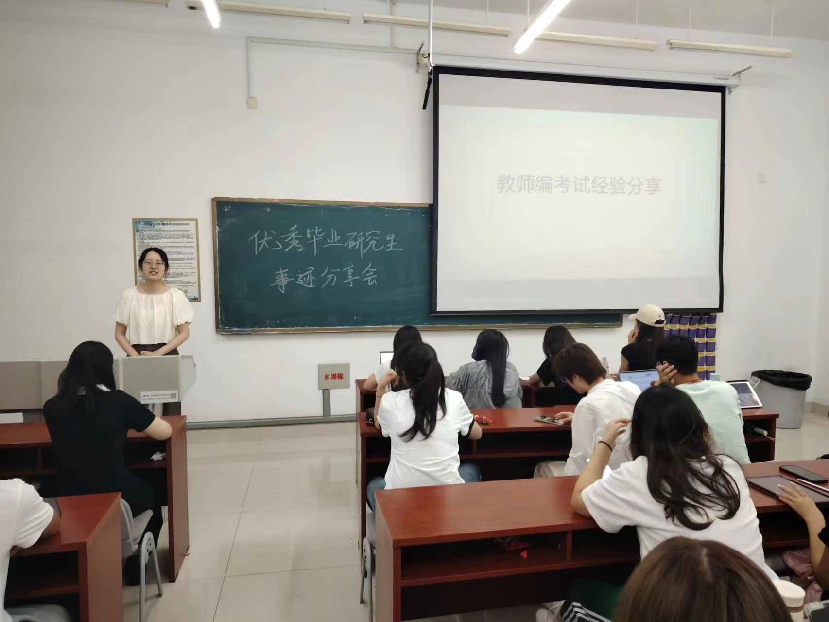 在考博成功的两位优秀毕业生分享结束后,讲座进行到了第二部分 —— 就业经验分享。首先由教师编上岸的张舒畅进行分享。她首先介绍了有关搜集招聘信息的一些公众号、小红书以及app。接下来又讲解了教师编招聘形式,包括人才引进、校招、社会招聘三种形式。她给同学们的建议是一定要提前熟悉课本,每一节课都提前做好课程设计,在面试时大方自然,展现自己最好的一面。
