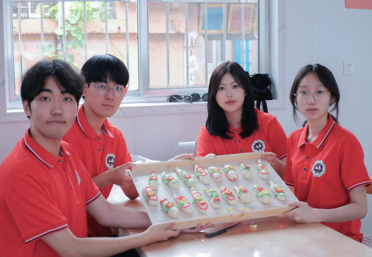 队员们在东烟墩村妇女主任胡迎晓的带领下进入本村的助老食堂,体验制作来自山东荣成的非物质文化遗产——花饽饽。胶东花饽饽是山东省胶东地区的一种传统面食,具有三百多年的历史,广泛运用于婚嫁、新年等民俗活动中,承载着太平安康、富贵长寿、风调雨顺等美好祝愿。花饽饽也成为当地人民日常生活中不可或缺的一部分,体现了胶东人民对美好生活的向往和追求。