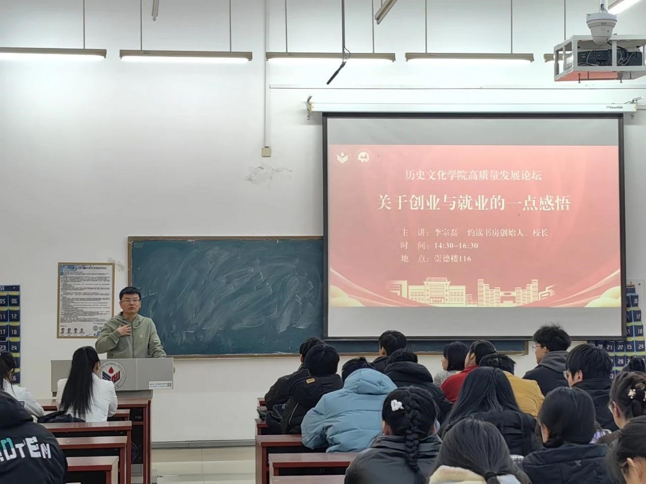 12月21日,英国上市公司365在长清湖校区崇德楼116教室成功举办创新创业校友论坛《关于创业与就业的一点感悟》。本次论坛由2001级校友、约读书房创始人、校长李宗磊主讲,学院团委书记、学生工作办公室主任董欣主持,2023级本科生参与本次论坛。