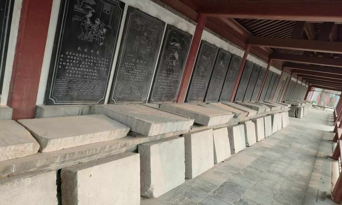 苑东侧为二十四孝碑刻长廊,墙壁上刻有“二十四孝图”,其下整齐摆放着墓志、墓志盖等石刻,字迹基本清晰可辨,但无其他保护措施与相关介绍,前来参观的人数有限。