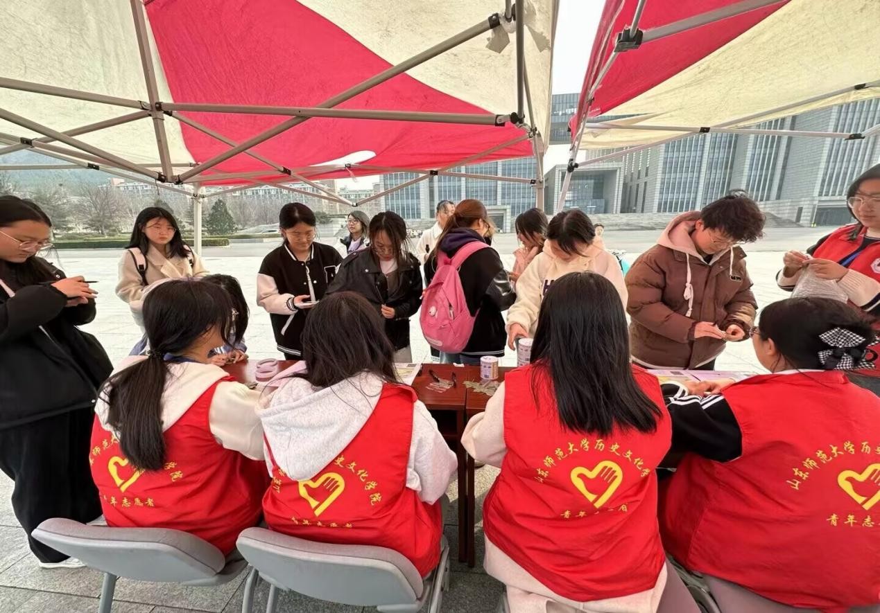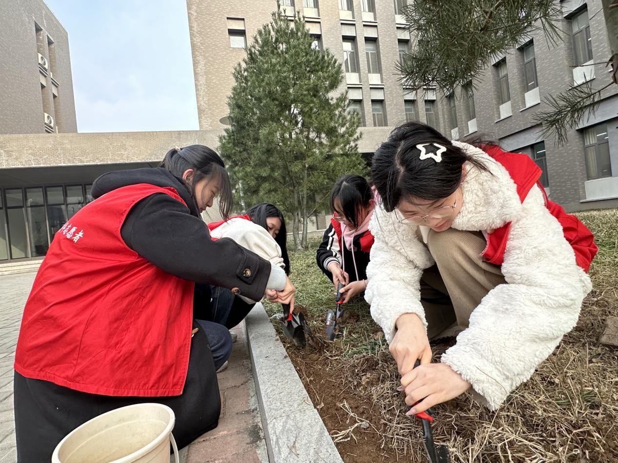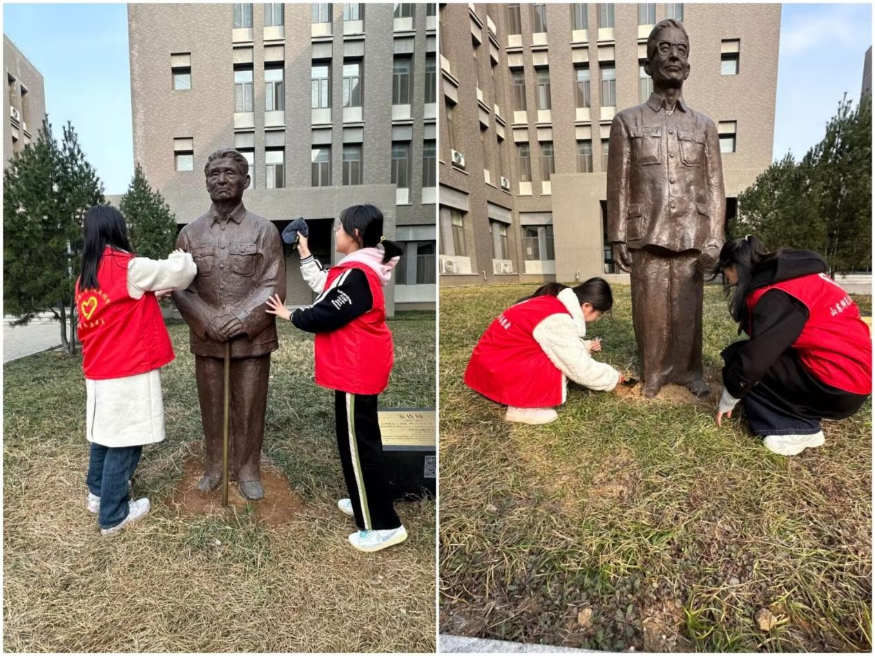 在学院绿植区,辅导员老师与青年志愿者同学协同开展花卉种植,挥锹培土、提水浇灌,新栽的向日葵与洋甘菊在春风中静待生长。同步进行的“拂尘敬贤”活动中,志愿者们仔细擦拭每一座塑像,让刘祚昌、安作璋、胡滨三位历史名家的塑像重现光彩。
