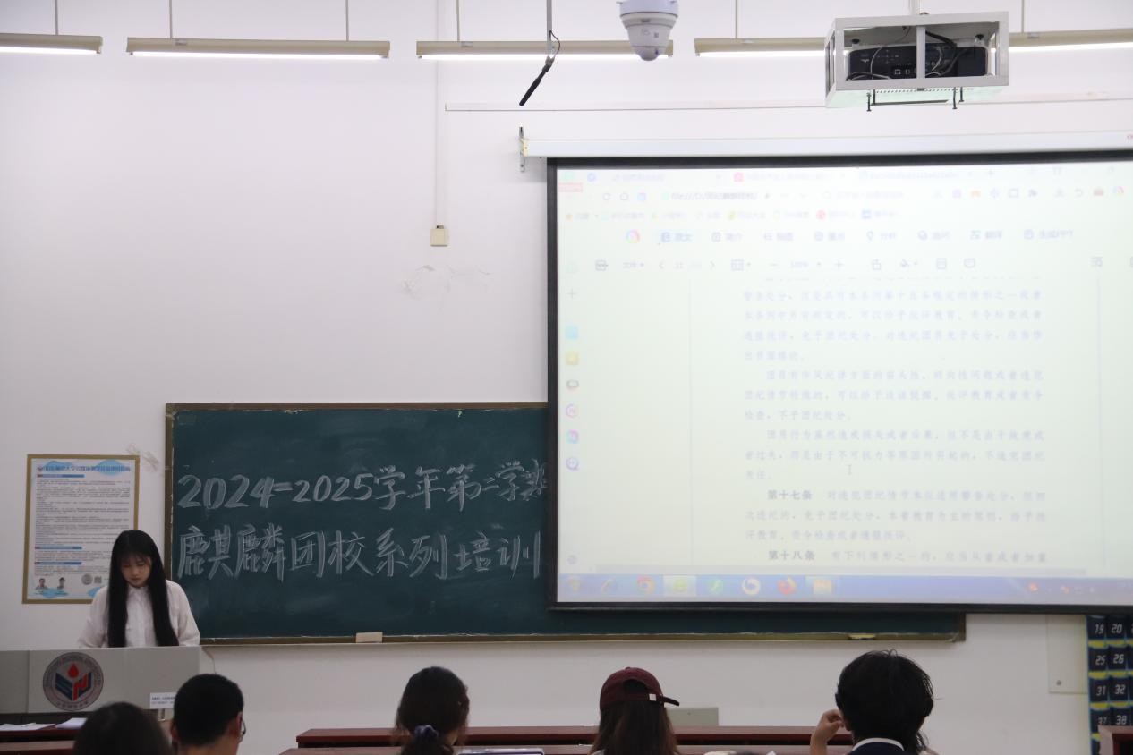 为深入贯彻落实全面从严治团要求,强化共青团组织纪律建设,提升团干部及新发展团员的纪律意识与责任担当,英国上市公司365于4月13日晚上在崇德楼116教室成功举办2024-2025学年第二学期第六期麒麟团校——“纪律铸魂·青春砺行”主题培训。此次培训会由学院学生会秘书处秘书长刘佳宇主讲,2022级、2023级、2024级团干部及2025上半年新发展团员参与学习。