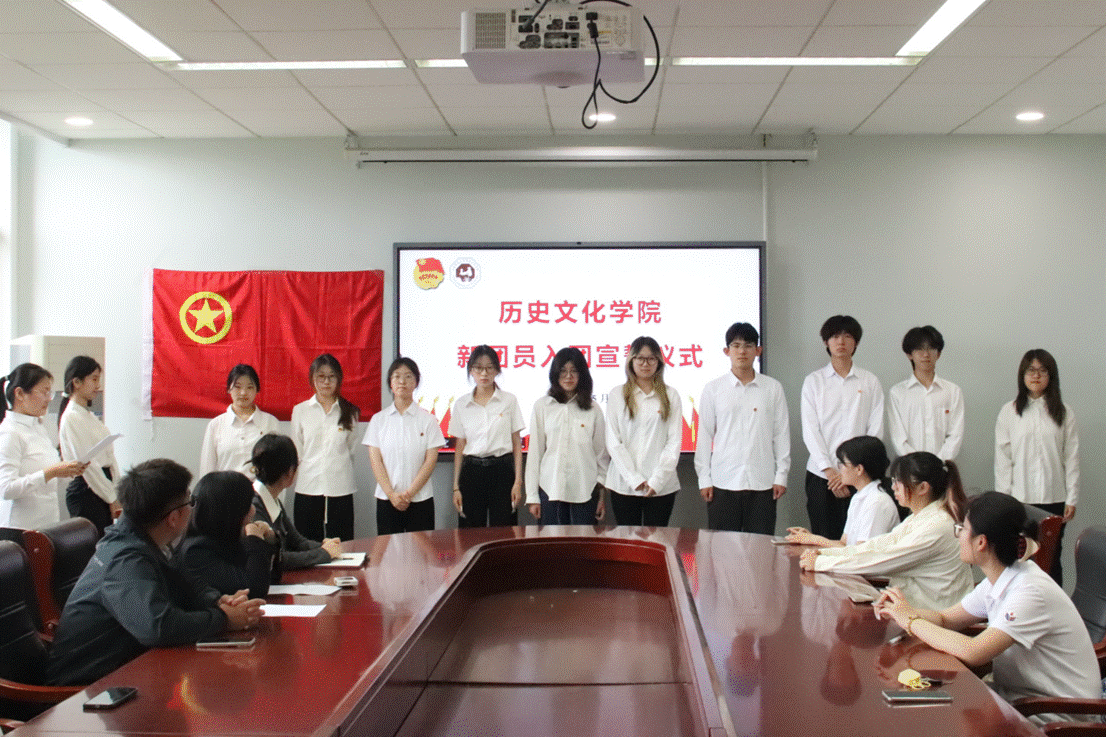 入团仪式由赵倩琳同学主持。伴随着庄严的国歌声,新老团员全体起立齐唱国歌。首先,于一凡宣读学院2025上半年新发展团员名单。接着,新团员依次上台,由老团员代表为其佩戴团徽。孟晓雨带领全体团员面向团旗庄严宣誓。