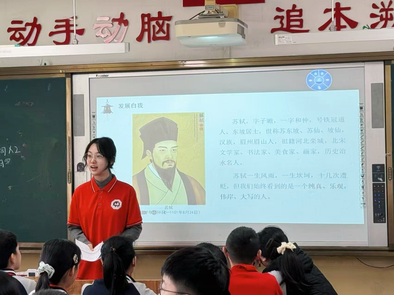 在“认识自我”部分,代瑞结合曾子“吾日三省吾身”的自省精神、庄子“庄周梦蝶”的观察哲思,以及孙武借交友明晰自身短处的经历,启发学生多角度认知自我。讲到“悦纳自我”时,她以李白屡经挫折仍坚守本心、欧阳修三度遭贬却寄情山水的故事,传递在逆境中保持达观的人生态度。在发展自我的维度中,她分享了苏轼经历“乌台诗案”后依然豁达向上、于困境中开拓新境的经历,鼓励学生在成长中积极超越自我。