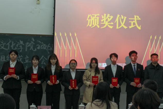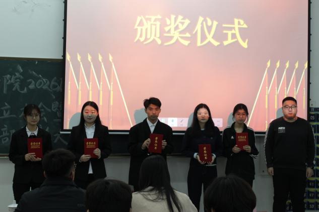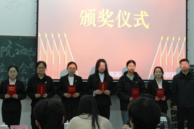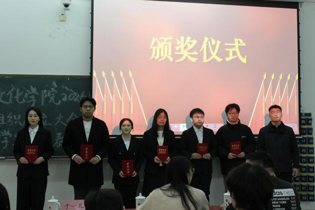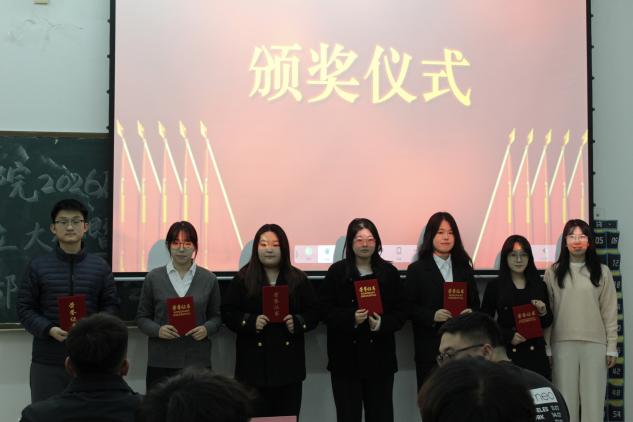 接着,童子豪宣读2025届优秀学生干部名单,对过去一年辛勤付出的2025届学生组织成员进行表彰。在全场的瞩目下,获奖同学依次上台,三位老师依次为他们颁发荣誉证书,一同合影记录下这份荣誉时刻。