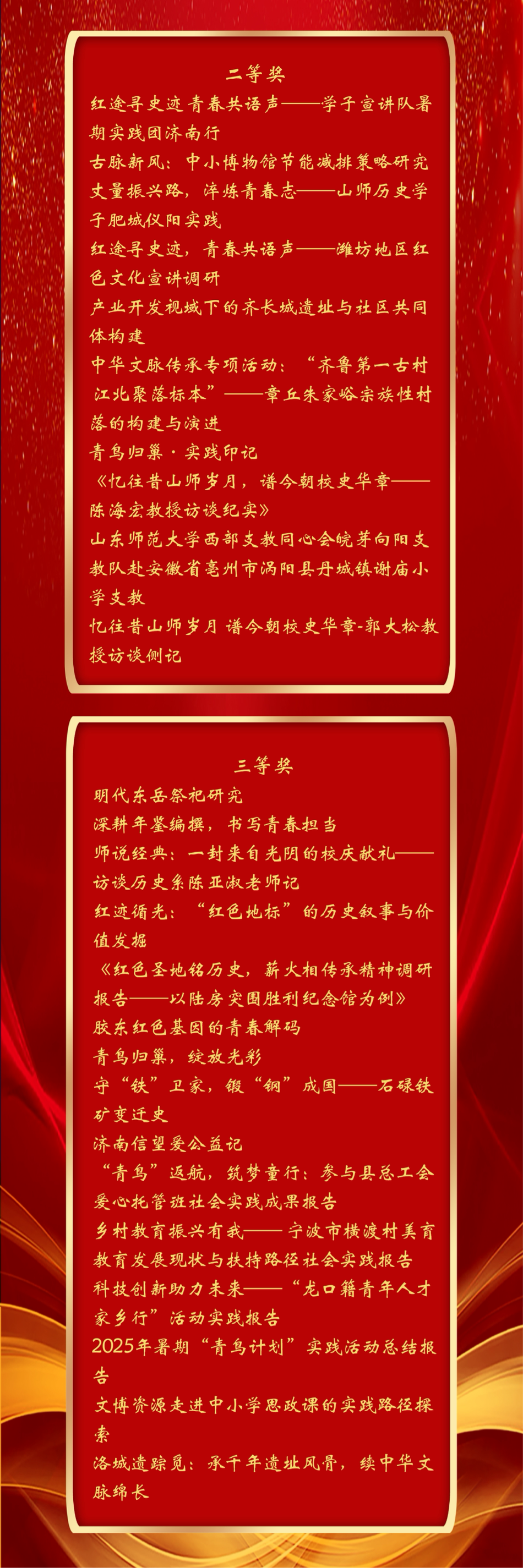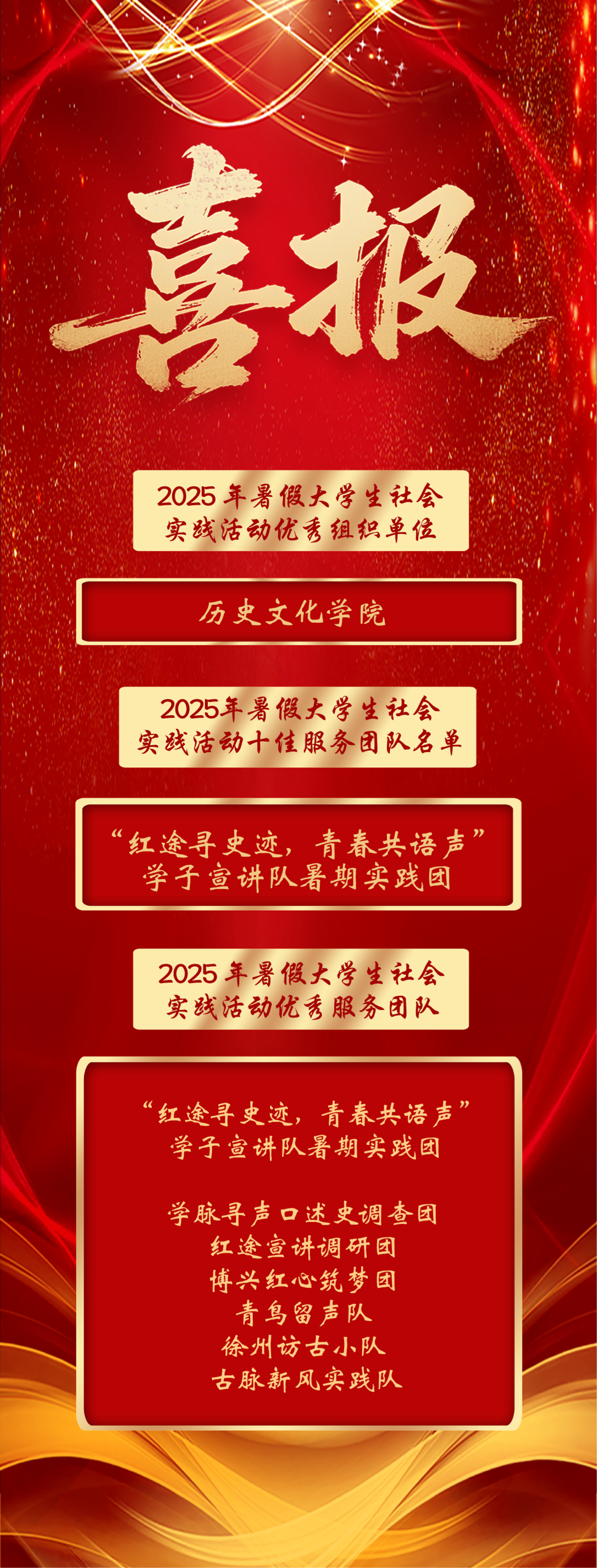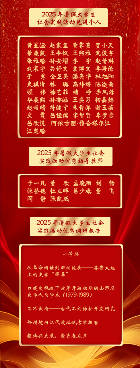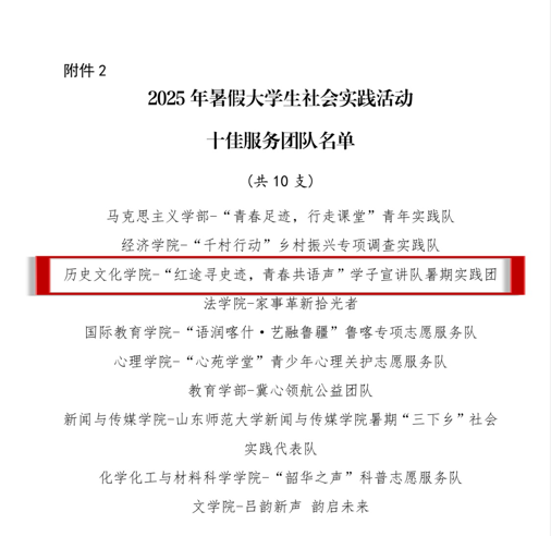 今年暑期,学院以“青春为中国式现代化挺膺担当”为主题,组建多支实践团队奔赴全国各地,围绕“红色记忆·乡村振兴·文化传承”主线,深入开展史料挖掘、场馆共建、基层宣讲、非遗调研、志愿服务等系列活动。师生们以史为据、以声传情,将课堂延伸至革命旧址、田间地头、社区讲堂与企业一线,在行走齐鲁中感悟家国情怀,在服务群众中锤炼实干本领,努力成长为担当民族复兴大任的时代新人。