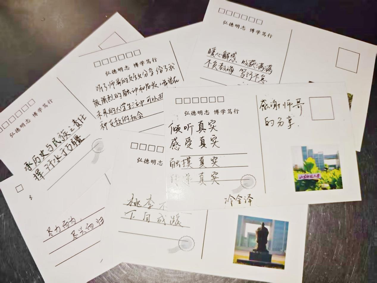 活动尾声,同学们在明信片上写下对未来的期许与活动感悟:“暖人解惑,收获满满,不负教诲,笃行不怠”、“聆听真实,感受真实,触摸真实,传递真实”,真挚的留言传递出同学们的思考与担当,董欣与路桐轩也为大家送上寄语。最后,全体人员合影留念,为本次沙龙画上圆满句号。
