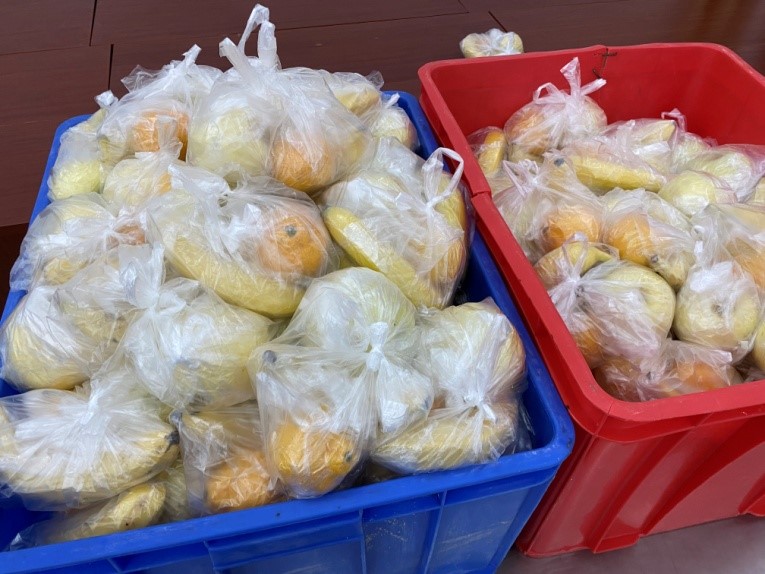 晚会开始之前,辅导员蒋艺贴心地为同学们准备了水果和月饼,并向第一次离家过节的新生们送上了关心和祝福。