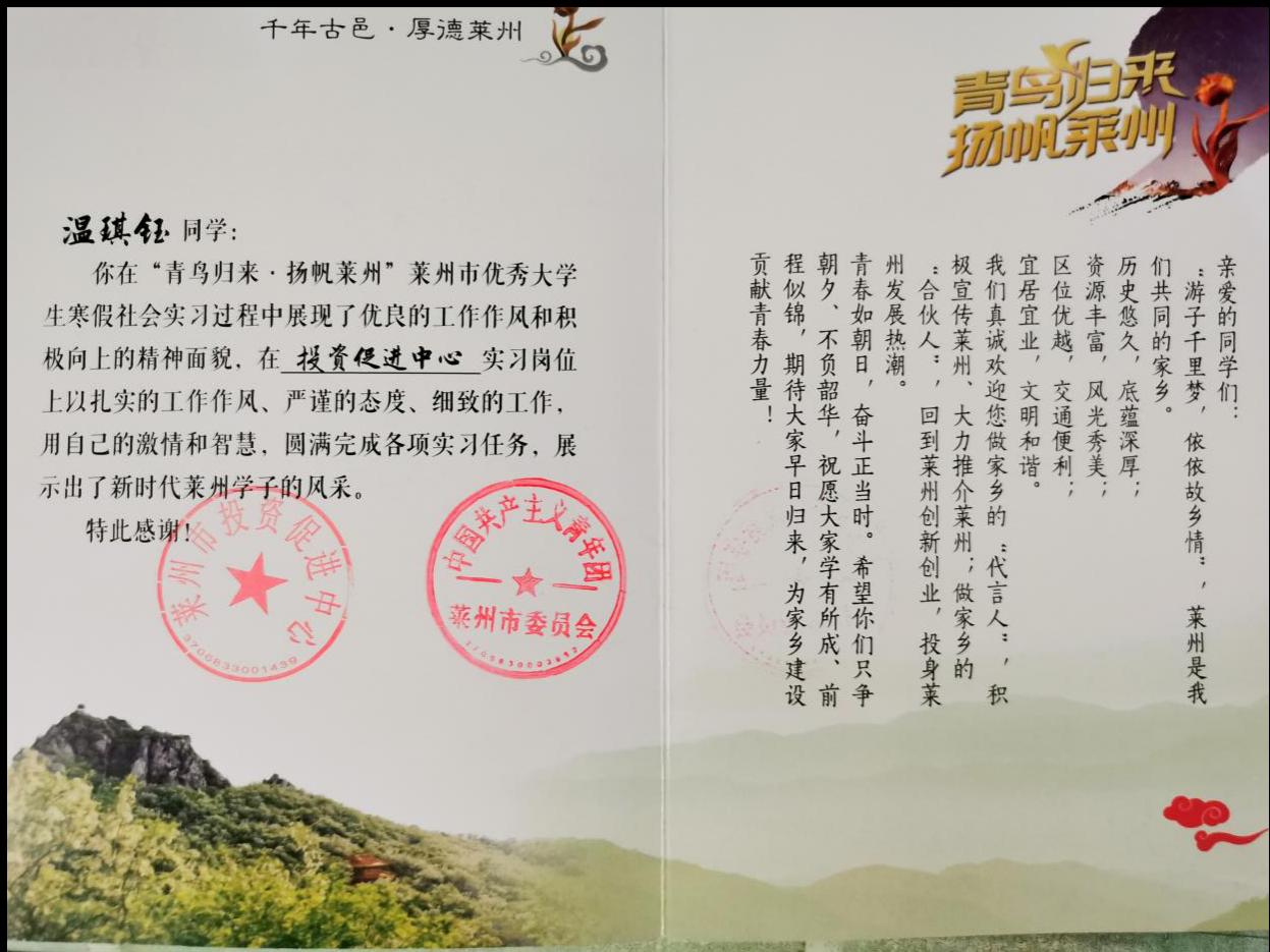 2019级温琪钰同学参加了莱州市“青鸟计划”寒假实习实践活动,于市投资促进中心的综合科开展了为期一个月的实习工作,主要负责协助完成撰写信息、校正稿件、文件传递等宣传工作,参与“双报到”活动和扶贫工作,为贫困人群、社区独居老人送去物资和温暖。这次经历扩展了她的知识面,提高了她的能力,为她今后的学习和工作提供了很多的思路和经验。