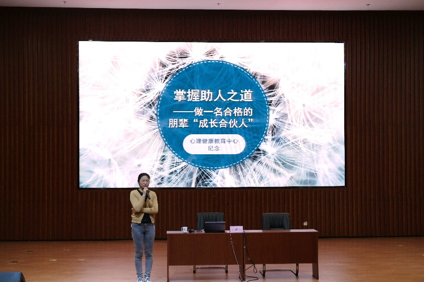 会议伊始,纪念以自身经历引出当前大学生心理健康建设的重要性。围绕“掌握助人之道——做一名合格的朋辈“成长合伙人”主题,纪念主要从以下四个方面进行讲解。