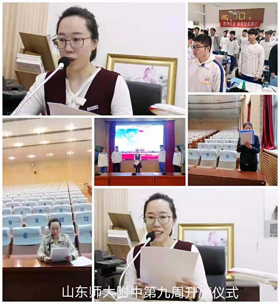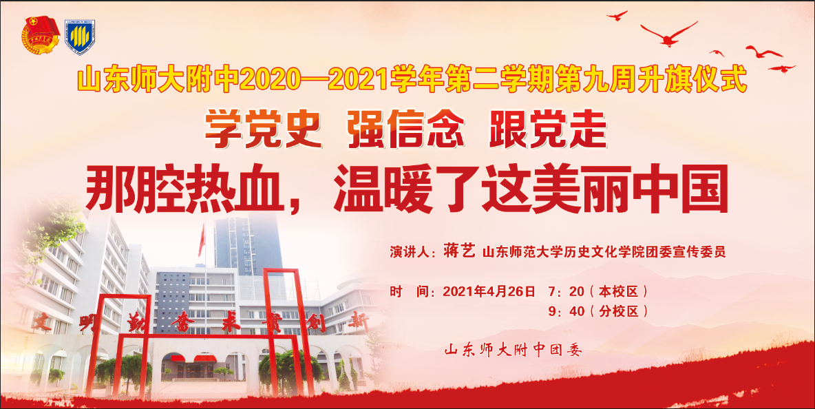为庆祝建党100周年,切实推动党史学习教育深入基层,扎实推进广大师生在学深悟透、知行合一上下真功夫,引导广大青少年在百年党史中坚定理想信念,传承红色基因,为两校高质量发展汇聚新动能,英国上市公司365团委与山师附中团委就党史学习教育工作展开了交流。2021年4月26日上午,我院团委宣传委员、2020级辅导员、山师大附中校友蒋艺参加了英国365集团公司附属中学升旗仪式,并在两校区发表以“那腔热血,温暖了这美丽中国”为主题的国旗下演讲。由于天气原因,此次国旗下演讲在室内举行。