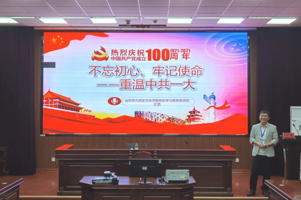 “中共一大的召开时间是哪天?”“建党节又为何定在七月一日?”王浩通过与法学院同学们的互动交流引入了宣讲主题。王浩首先带领同学们重温了中共一大召开的背景,简要介绍了各地的共产主义小组,以及出席中共一大的十三名国内同志。接着,又为同学们讲解了7月1日成为党的生日的历程。随后,王浩以邵维正教授在《中国社会科学》杂志发表的相关文章为依据,分析了邵教授是如何用口述与回忆录、间接证据、文字档案等多方面材料论证一大召开于7月23日的。同时,王浩也指出中国共产党成立的准确日期最终被考证出来,但是党的纪念日——“七一”曾在抗日救亡的历史时期鼓舞全党斗志,并经过半个多世纪的岁月洗礼,已经深入人心,成为中国共产党人和全国各族人民心中的重要纪念日。党史百年,吾辈恰是风华正茂,最后,王浩引用习近平总书记在党史学习教育动员大会上的讲话,鼓励同学们“增强历史自觉,把苦难辉煌的过去、日新月异的现在、光明宏大的未来贯通起来”,用实事求是的精神在党的新百年征程中不断拼搏奋斗。