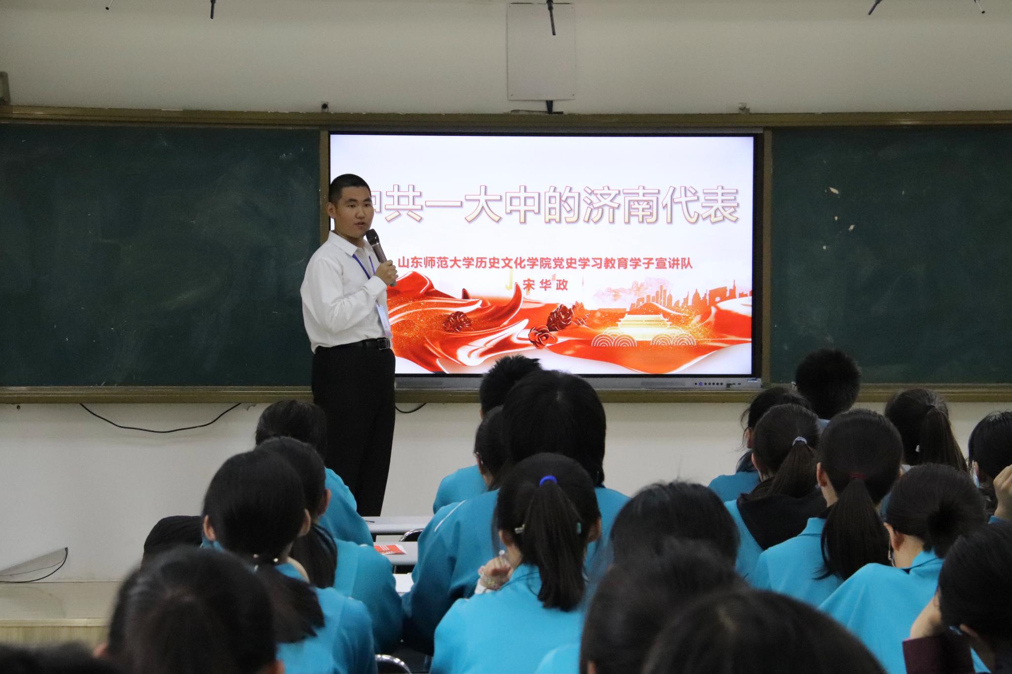 宣讲从坐落在济南五龙潭公园内东南侧的王尽美与邓恩铭雕像展开。宋华政首先向同学们简要介绍王尽美与邓恩铭同志的生平。接着,他又为同学们讲解了王尽美与邓恩铭结识、创办《励新》刊物、成立济南共产小组的过程。随后,宋华政通过中共一大旧址的照片引入,介绍王、邓二人参加中共一大及远东各国共产党及民族革命团体第一次代表大会的场景。同时,宋华政指出王尽美与邓恩铭在如此年纪,却又有不凡的谈吐,这一切都是源自于他们对马克思主义理论的认真学习研读,并以此激励同学们好好学习,汲取更多知识。最后,宋华政向同学们讲述了王尽美病逝及邓恩铭慷慨就义的经过,总结二人短暂而又光荣的一生。今年恰是山师二附中建校40周年,他以此鼓励同学们接好先辈们手中的接力棒,树立远大理想,为中华民族伟大复兴贡献自己的一份力量。