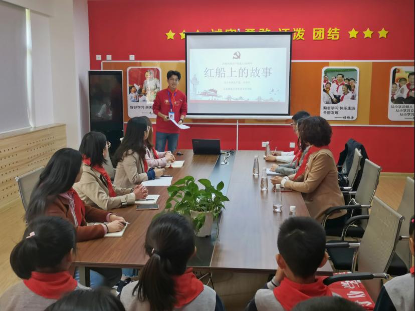 学子宣讲队成员王春墨以“红船上的故事”为主题,带领少先队员们回顾了第一次全国代表大会的召开及中国共产党的诞生。他根据同学们的年龄特点和认知基础,运用历史与现今对比的方法,生动形象地诠释了党员人数、党的影响力等今非昔比的变化,增强了少先队员们对党史的理解。在此基础上,他把“红船”的概念做了深入的阐释:红船不仅仅是嘉兴南湖红船,这一画舫的物质形态,更象征了共产党人的革命信仰。少先队员们也根据自己的知识储备,举例说明了黄继光、邱少云等英雄模范对他们精神信念上的激励与鼓舞。