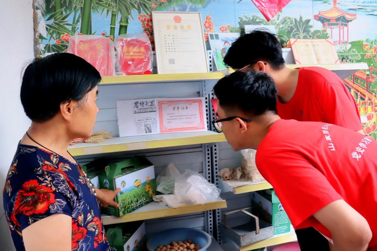 随后,王殿梅带领实践队队员参观了她的“荣誉墙”,包括她的获奖证书、被报道的文章复印件等。紧接着,她表示自己目前正在借助网络平台向全国宣传“孝里小米”,并向我们展示了直播工具。由于只有小学文化,她的宣传语还存在错别字,实践队队员们积极为她思考宣传语,并撰写标语,为其小米的宣传出一份力,为乡村振兴尽一份心。采访最后,王殿梅嘱咐到,“人这一辈子一定要干成一件事,你们要懂文化,懂科学,懂技术”。