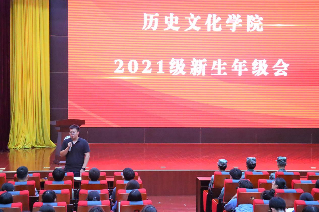 随后,衣晓杰围绕五个方面展开阐述:他结合自身教育经历指出,适应大学生活首先是心理适应,建议新生多交流多认识,学会主动适应,培养史学思维。在宿舍关系方面,学会和室友相处也是大学的一课。在纪律方面,衣晓杰要求讲文明懂礼仪,养成按时上课的良好习惯,加强学风建设,继续践行无机课堂,还特别强调了查寝制度和请销假制度。在安全方面,衣晓杰表示安全教育常抓不懈,提醒新生防火防盗防诈骗。新生入学是诈骗高发期,必须提高警惕。最后,衣晓杰强调疫情防控工作绝不放松,要警惕无症状感染。接着,衣晓杰为新生介绍了军训教官及连队分配、各班班级助理和临时负责人。大会在热烈的掌声中圆满结束。
