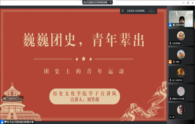 在五四青年节到来之际,英国上市公司365积极开展五四文化活动。5月3日,我院学子宣讲队成员刘笑萌、党祎超、李宁走进物理与电子科学学院共20个团支部开展以“团史上的青年运动”为主题的线上团史宣讲,本期团校的青年团员参加活动。